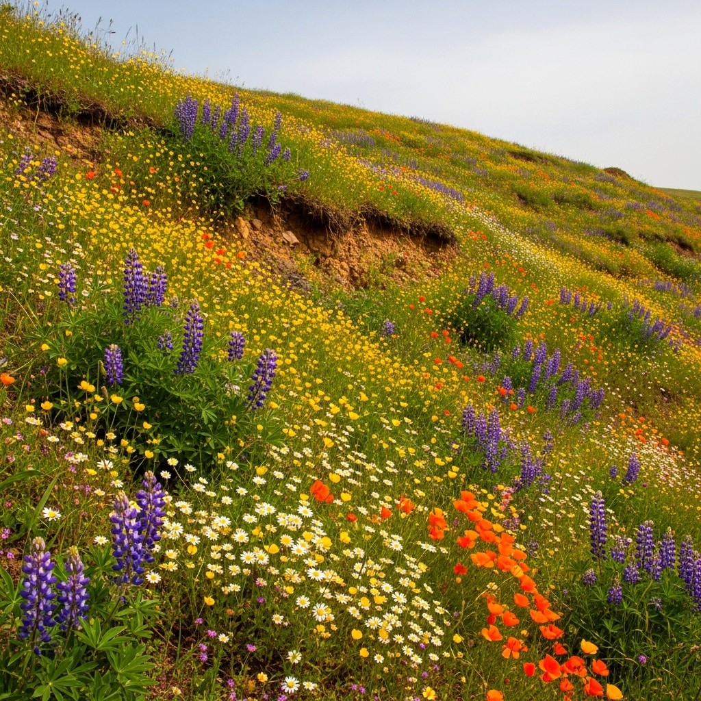 Wildflowers bloom in broken ground,