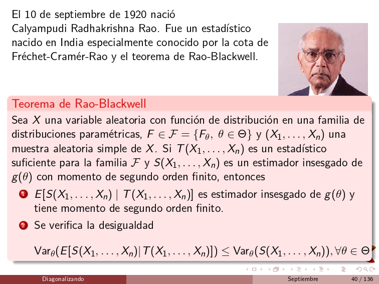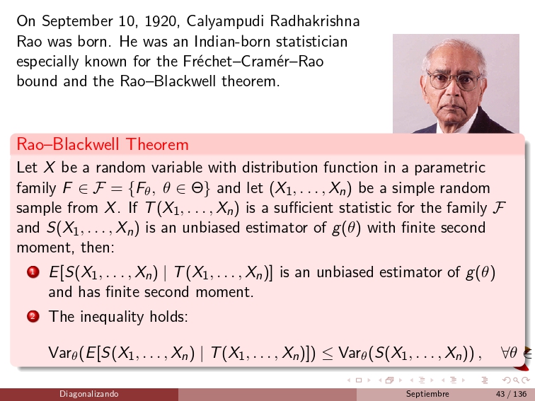 On September 10, 1920, Calyampudi Radhakrishna Rao was born. He was an Indian-born statistician especially known for the Fréchet–Cramér–Rao bound and the Rao–Blackwell theorem.