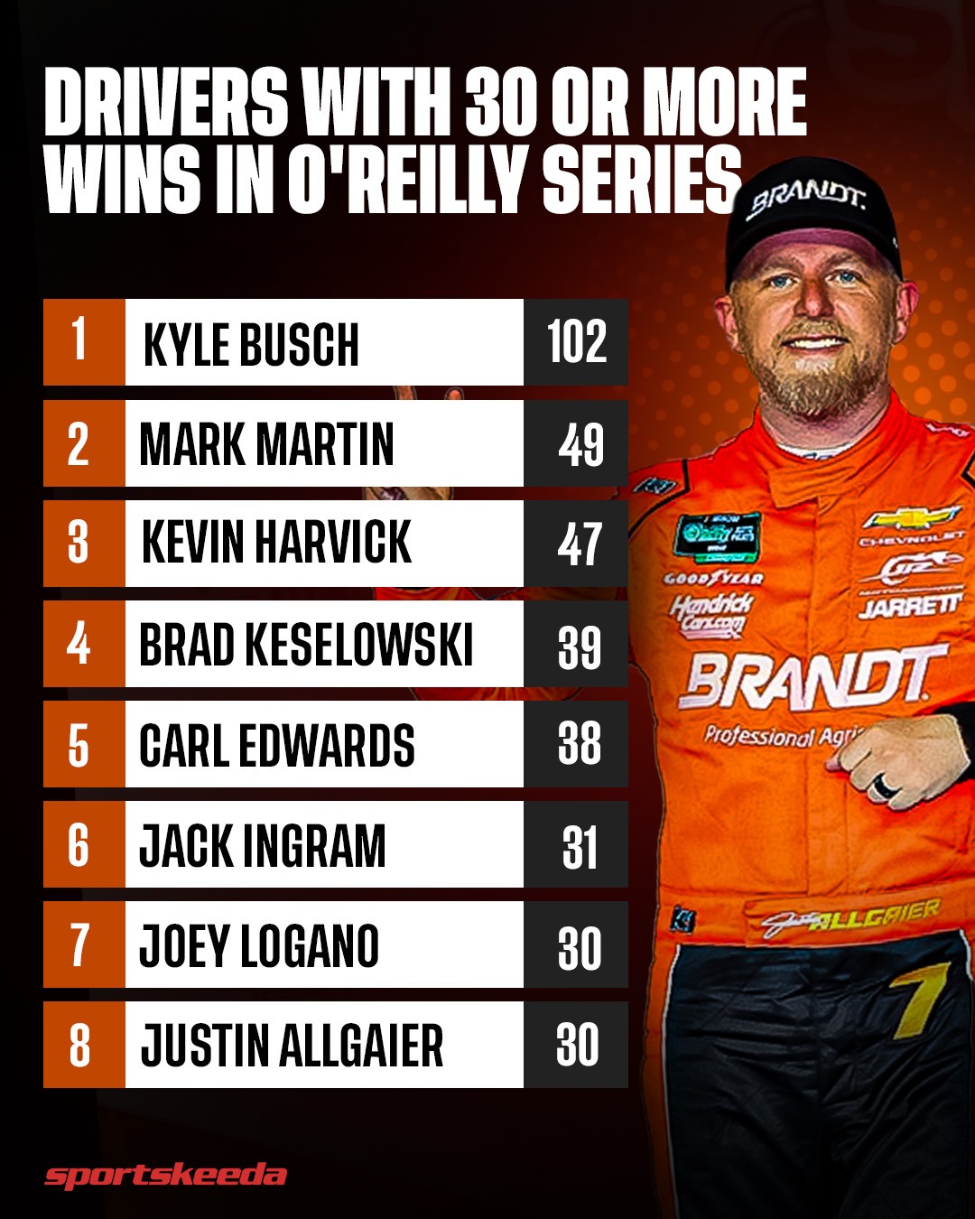 Sportskeeda NASCAR @NASCARatSK · 6d Justin Allgaier joins elite company with 30 wins, entering a legendary O’Reilly Auto Parts Series club 🏁 #JustinAllgaier #NASCAR #StockCarRacingD 4 22 831