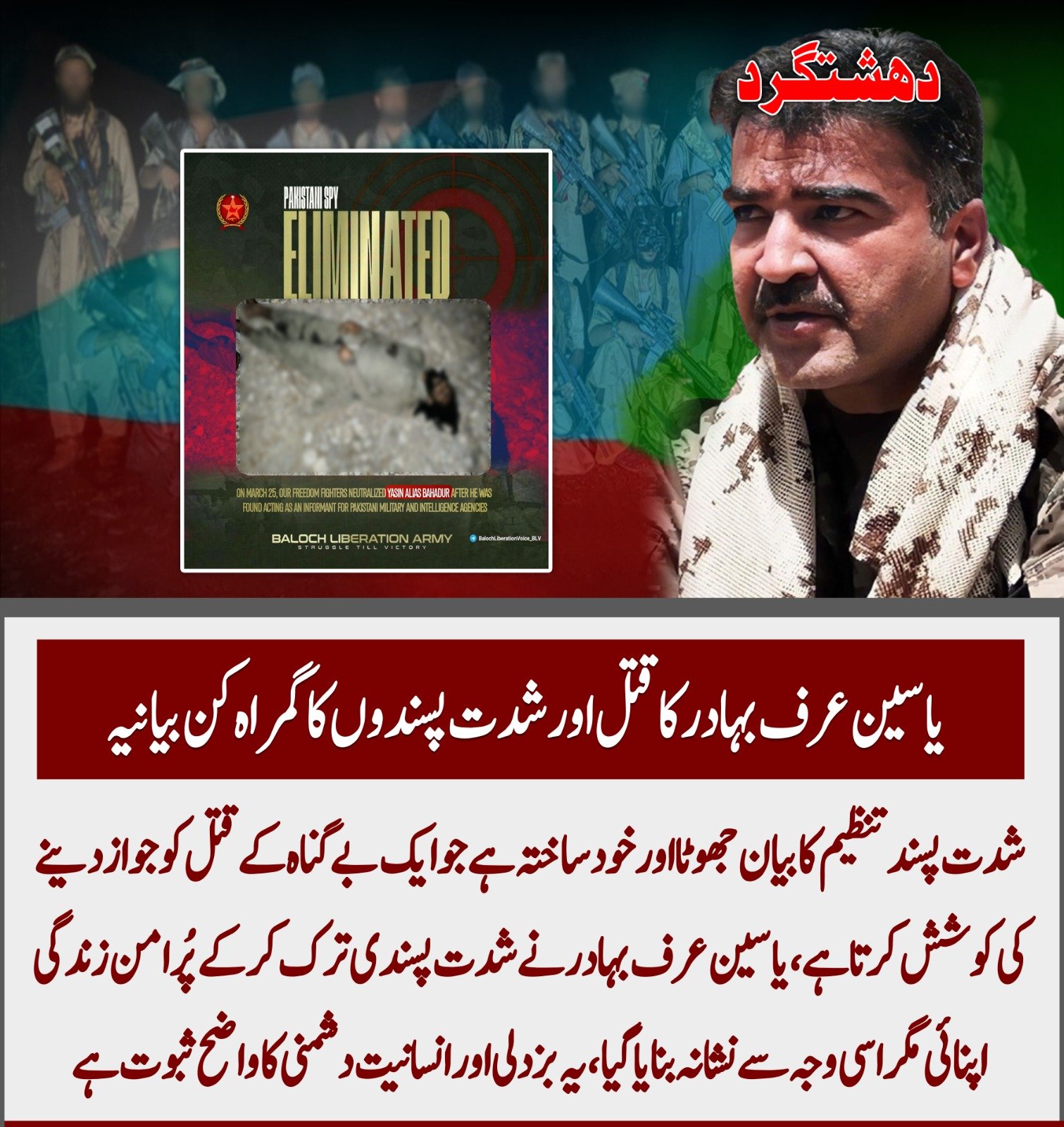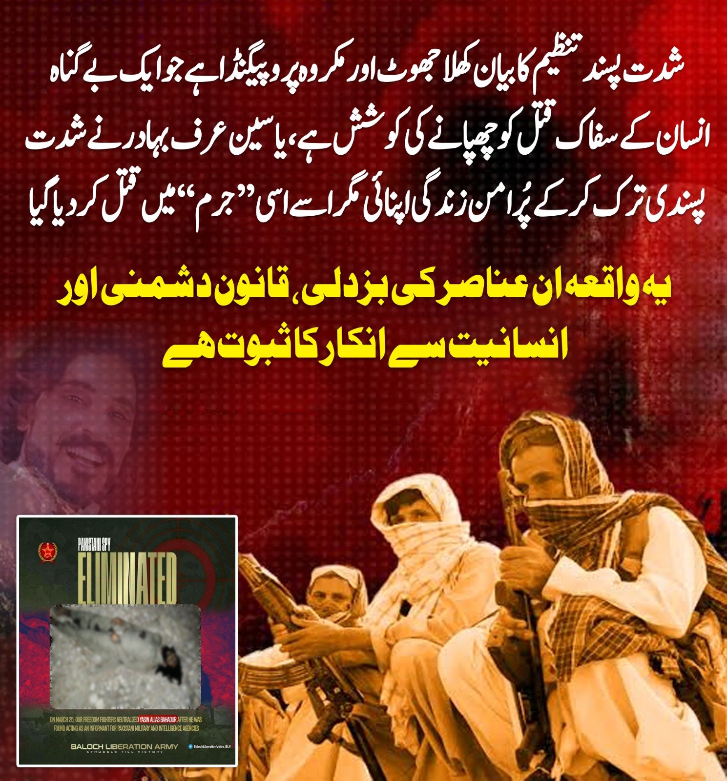 شدت پسند تنظیم کا بیان جھوٹا اور خود ساختہ ہے جو ایک بے گناہ انسان کے قتل کو جواز دینے کی ناکام کوشش ہے؛ حقیقت میں یاسین عرف بہادر نے شدت پسندی ترک کر کے پُرامن زندگی اختیار کی تھی.