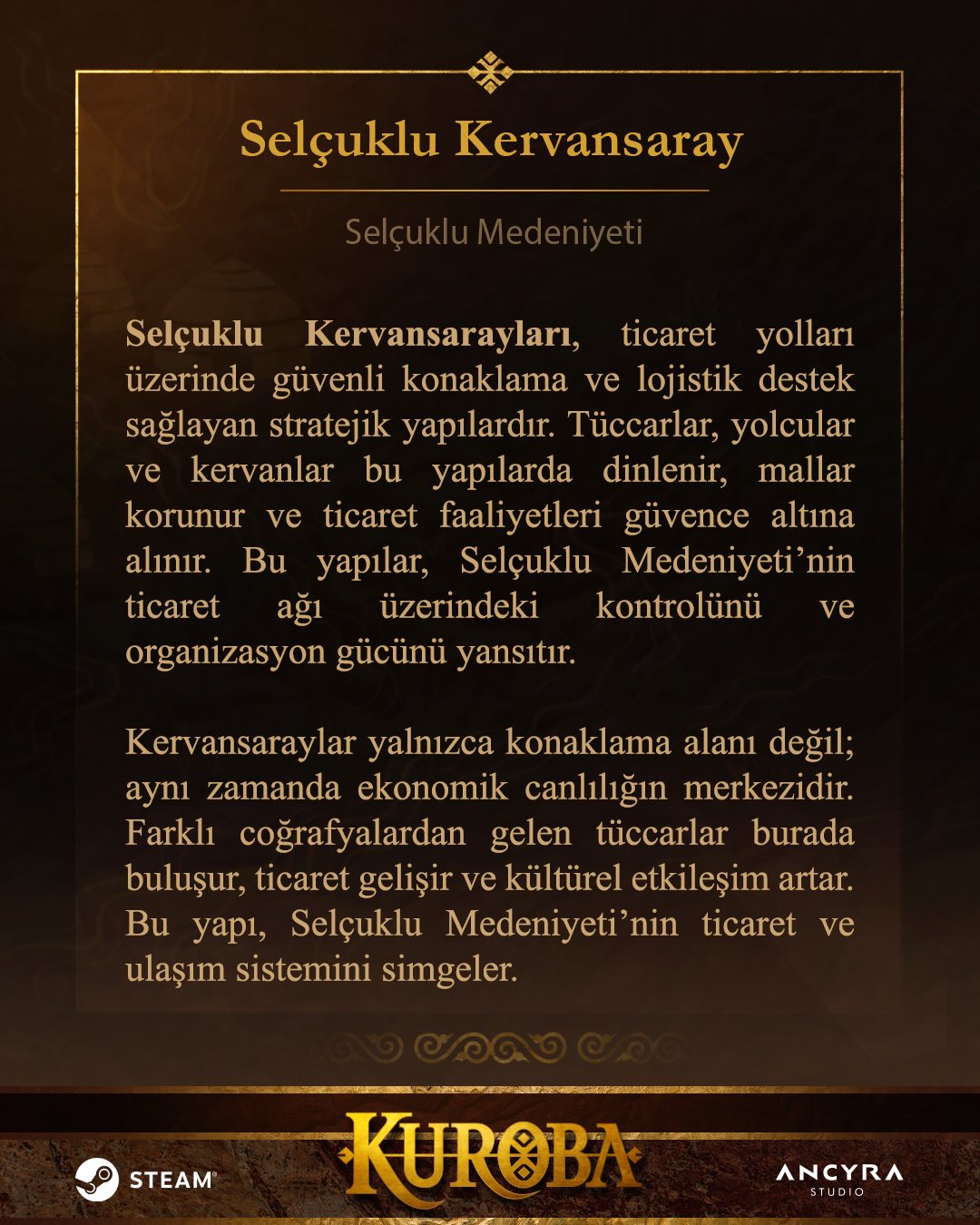 Kervanlar konaklar, ticaret yolları burada birleşir ve güven altına alınır. Bir medeniyetin gücü yalnızca savaşta değil, ticarette yükselir.