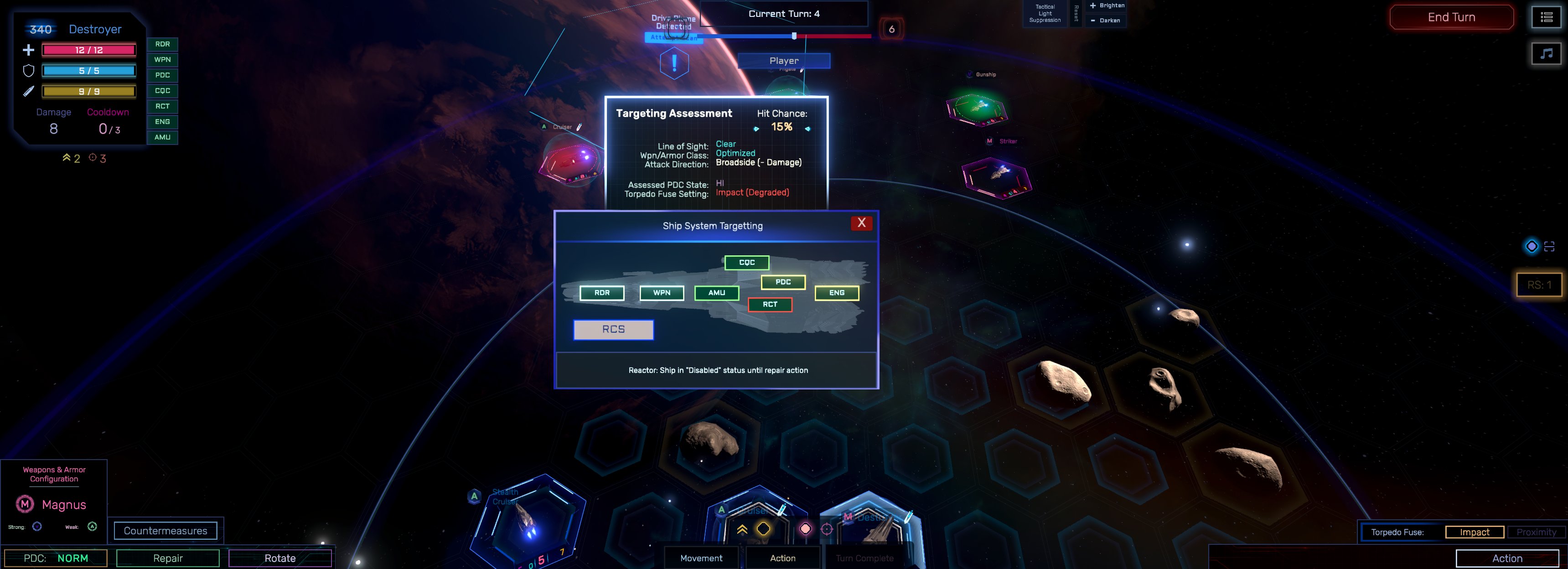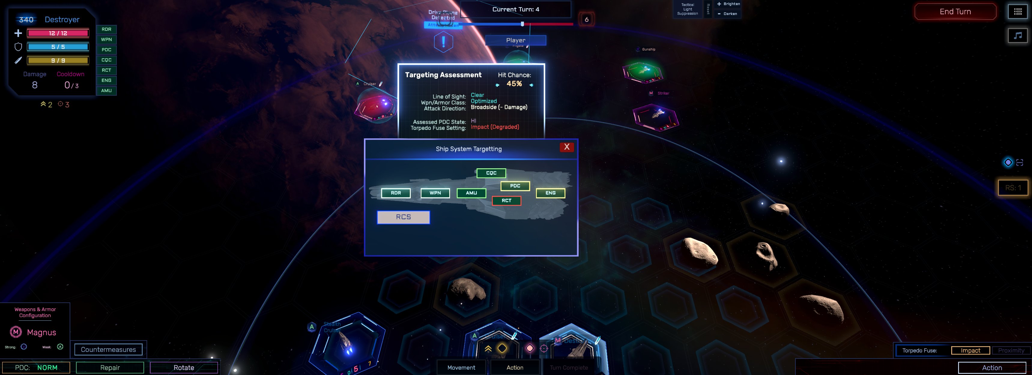 Targeting various subsystems now greatly changes your attack's hits chance based on where your ship is positioned relative to the facing direction of its target. For example, front-side attacks are more likely to damage radar or weapons systems.