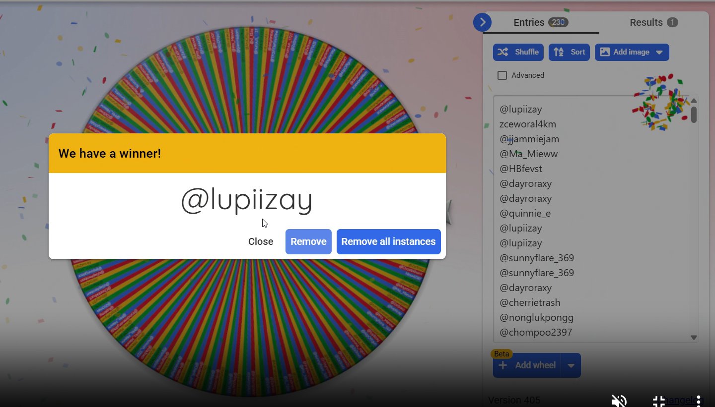 ผู้โชคดีที่ได้รับน้ำหอมได้แก่ @lupiizay รบกวนทักพี่เพื่อทิ้งที่อยู่ไว้ด้วยนะคะ ยินดีด้วยค่ะ