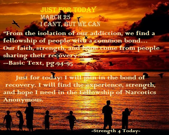 Just for today: I will join in the bond of recovery. I will find the experience, strength, and hope I need in the Fellowship of Narcotics Anonymous.