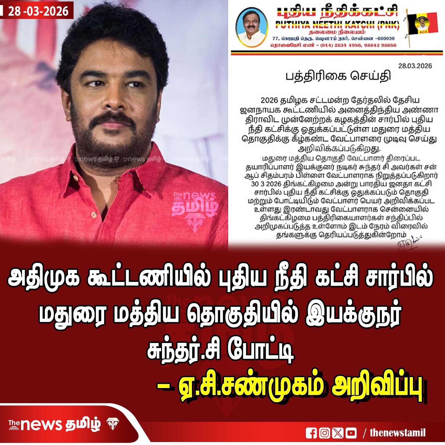 புதிய நீதிக் கட்சி சார்பில் மதுரை மத்தியில் இயக்குநரும் நடிகருமான சுந்தர் சி போட்டியிடுவார் என அக்கட்சித் தலைவர் ஏ.சி.சண்முகம் அறிவிப்பு.