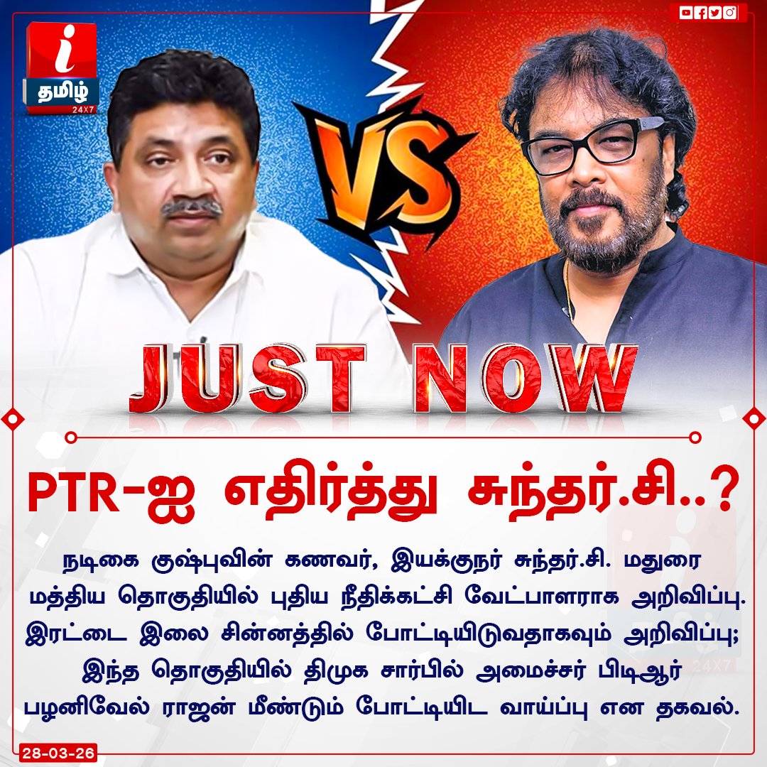 #JustNow | நடிகை குஷ்புவின் கணவர், இயக்குநர் சுந்தர்.சி. மதுரை மத்திய தொகுதியில் புதிய நீதிக்கட்சி வேட்பாளராக அறிவிப்பு!