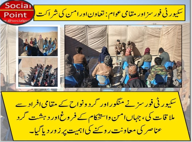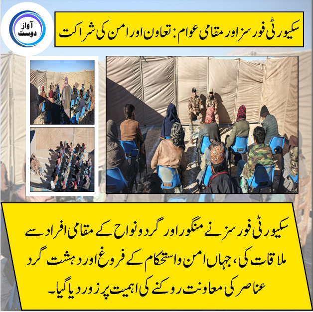 سیکیورٹی فورسز نے منگور اور گردونواح کے مقامی افراد سے ملاقات کی ، جہاں امن و استحکام کے فروغ اور دہشت گرد عناصر کی معاونت روکنے کی اہمیت پر زور دیا گیا۔