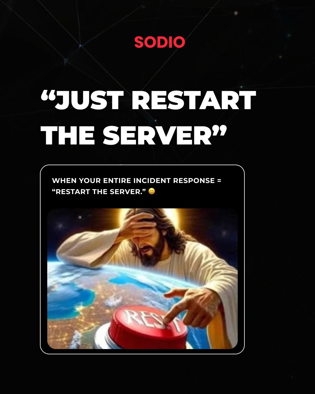 Sodio Technologies @sodiotech · Feb 15 “Just restart the server” — the universal fix for everything. 😅💻 When your incident response strategy has only one button. #DevOpsLife #IncidentResponse #SysAdminHumor #TechMemes #ServerIssues #ITLife #CloudComputinghS 8