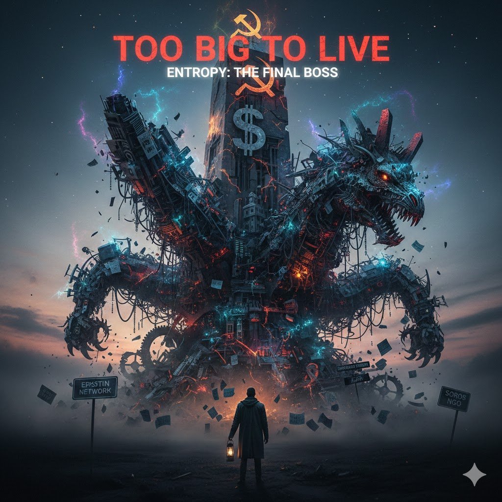 Why "too big to live"? Small corruption can hide (low entropy: simple lies). But growth demands more layers (e.g., Epstein networks covering Clinton Foundation schemes, Soros NGOs masking Ukraine aid fraud), increasing disorder. Historical examples: Soviet Union's black markets (internal entropy from failed central planning) led to 1991 collapse; Venezuela's narco-socialism bloated until Trump's 2026 raid exposed it. Nuances: Not all systems collapse equally—hybrids like China's state capitalism delay entropy with market tweaks, but even they face cracks (e.g., PEI infiltration allegations). Edge case: If external "energy" (e.g., endless U.S. aid) sustains it, collapse delays, but compounds global entropy.