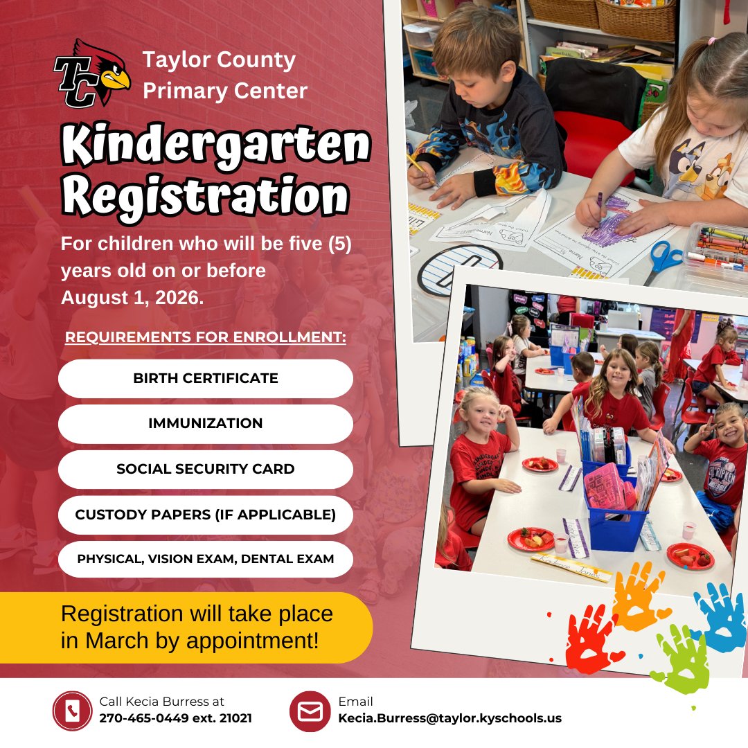 ππππππππ: Kindergarten registration is NOW OPEN for the 2026-2027 school year for children who will be five (5) years old on or before August 1, 2026.