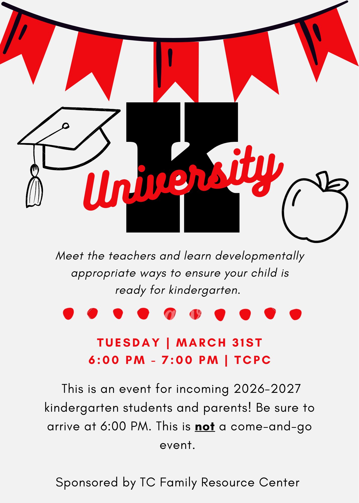 ππππππππ: K University is on Tuesday, March 31, 2026, from 6:00 - 7:00 PM for incoming kindergarteners and their parents/guardians!