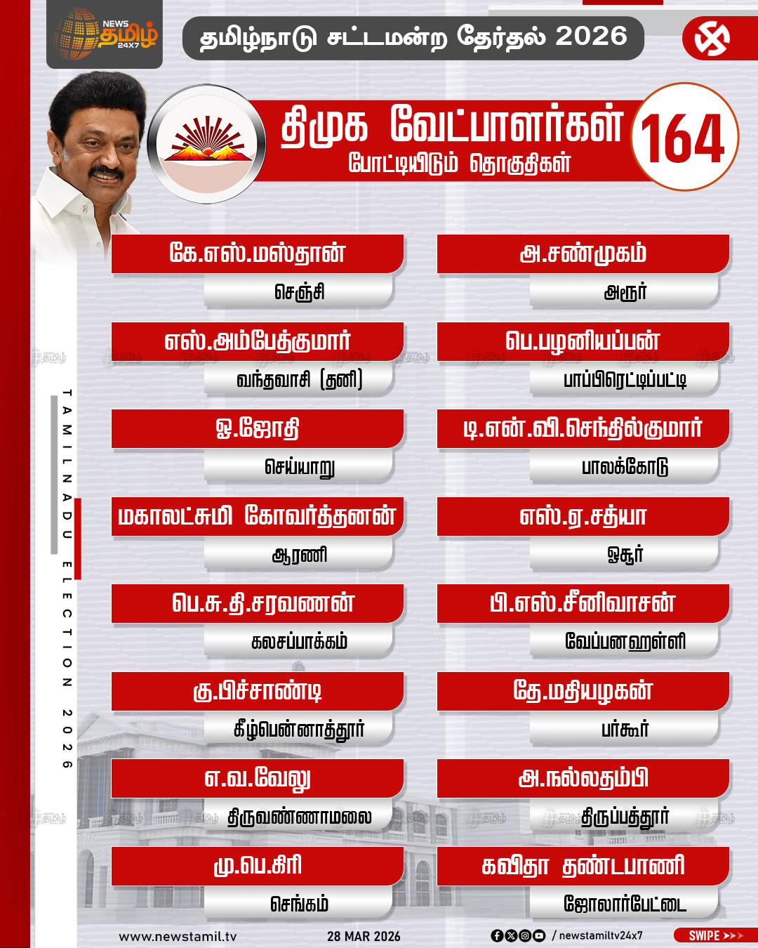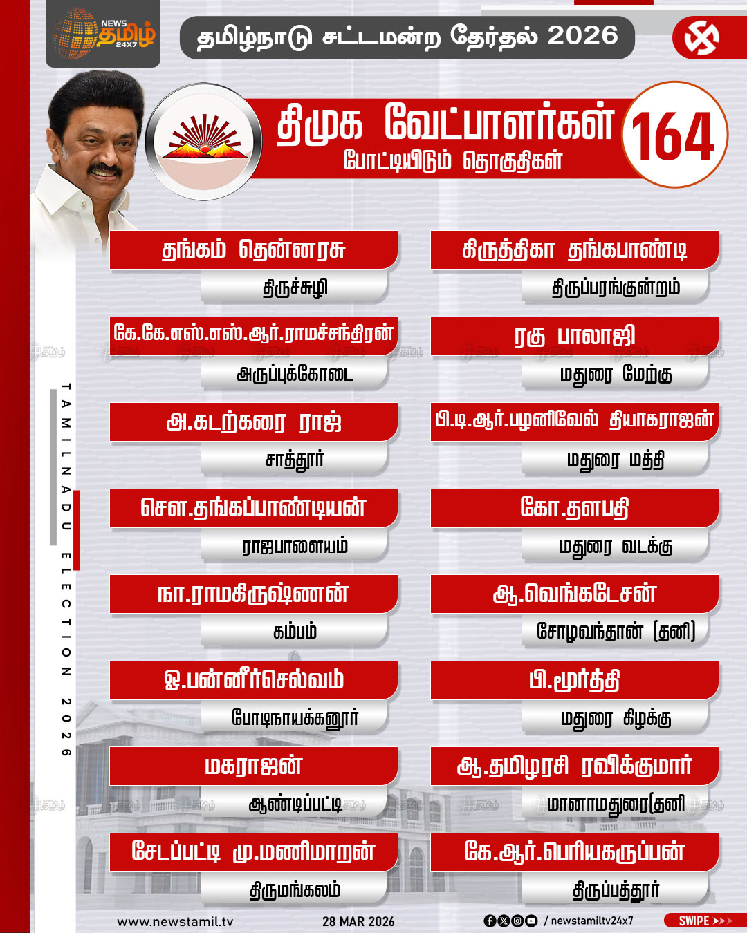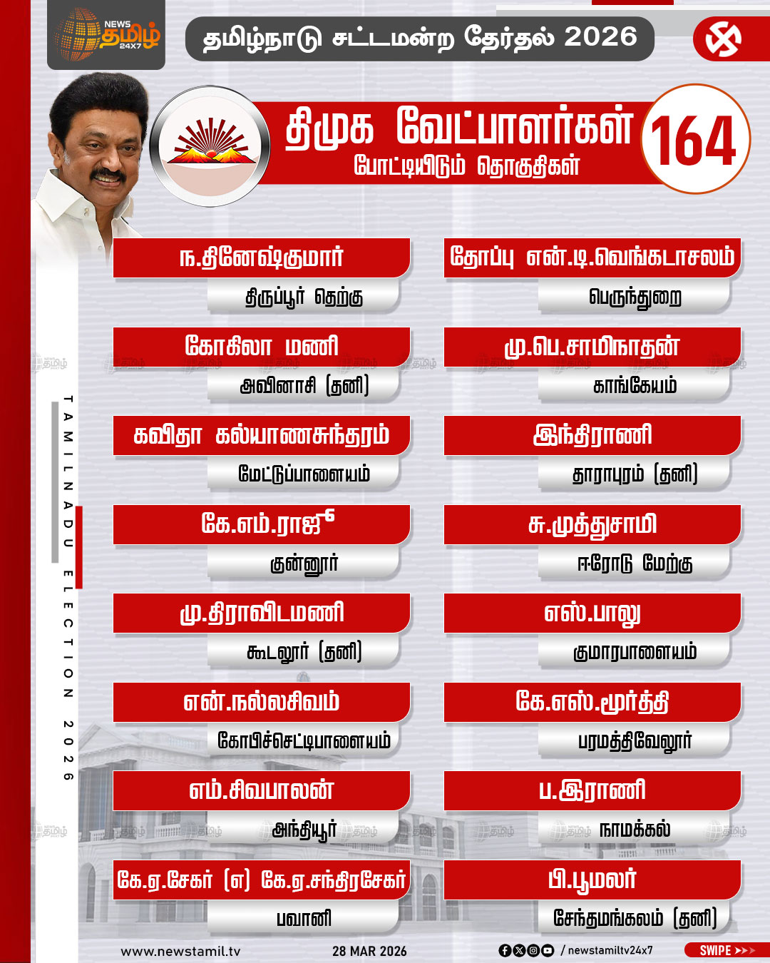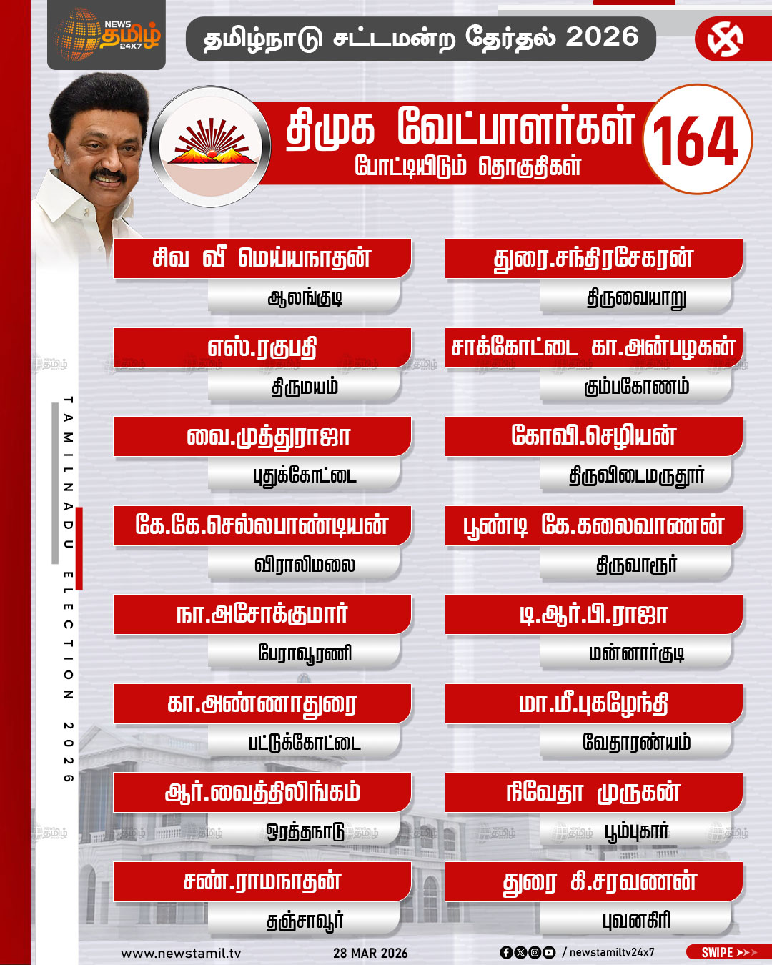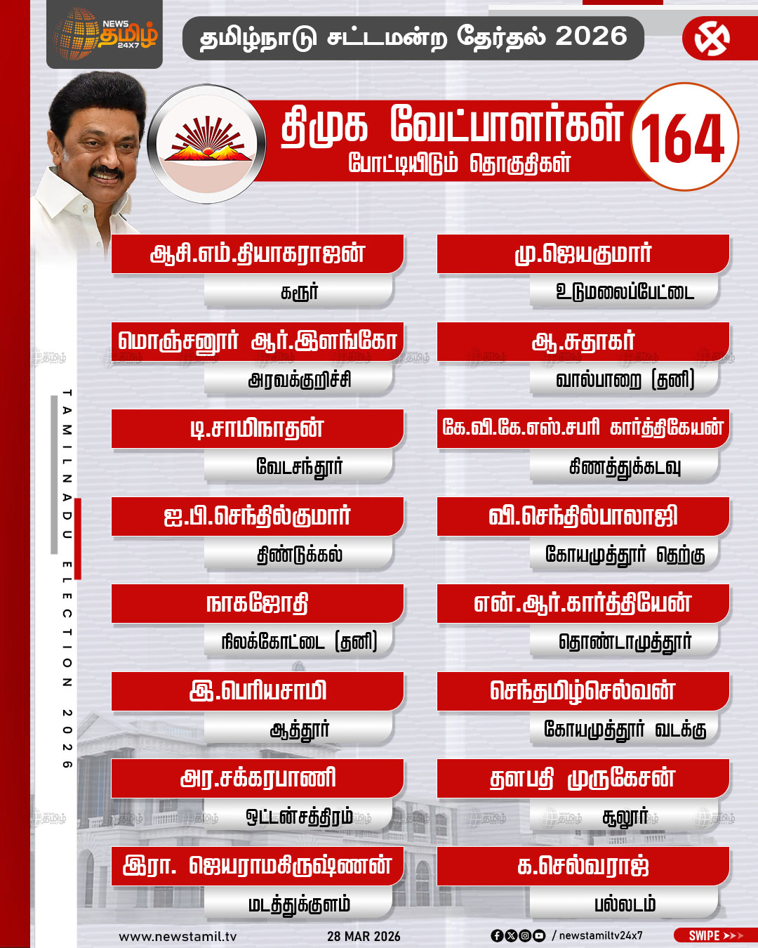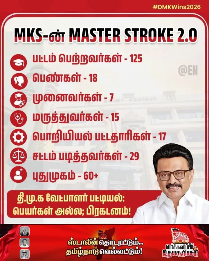 TN Election 2026 | தமிழக சட்டமன்ற தேர்தலில் திமுக போட்டியிடும் தொகுதிகள் மற்றும் வேட்பாளர்கள் பட்டியல் விவரம்..!