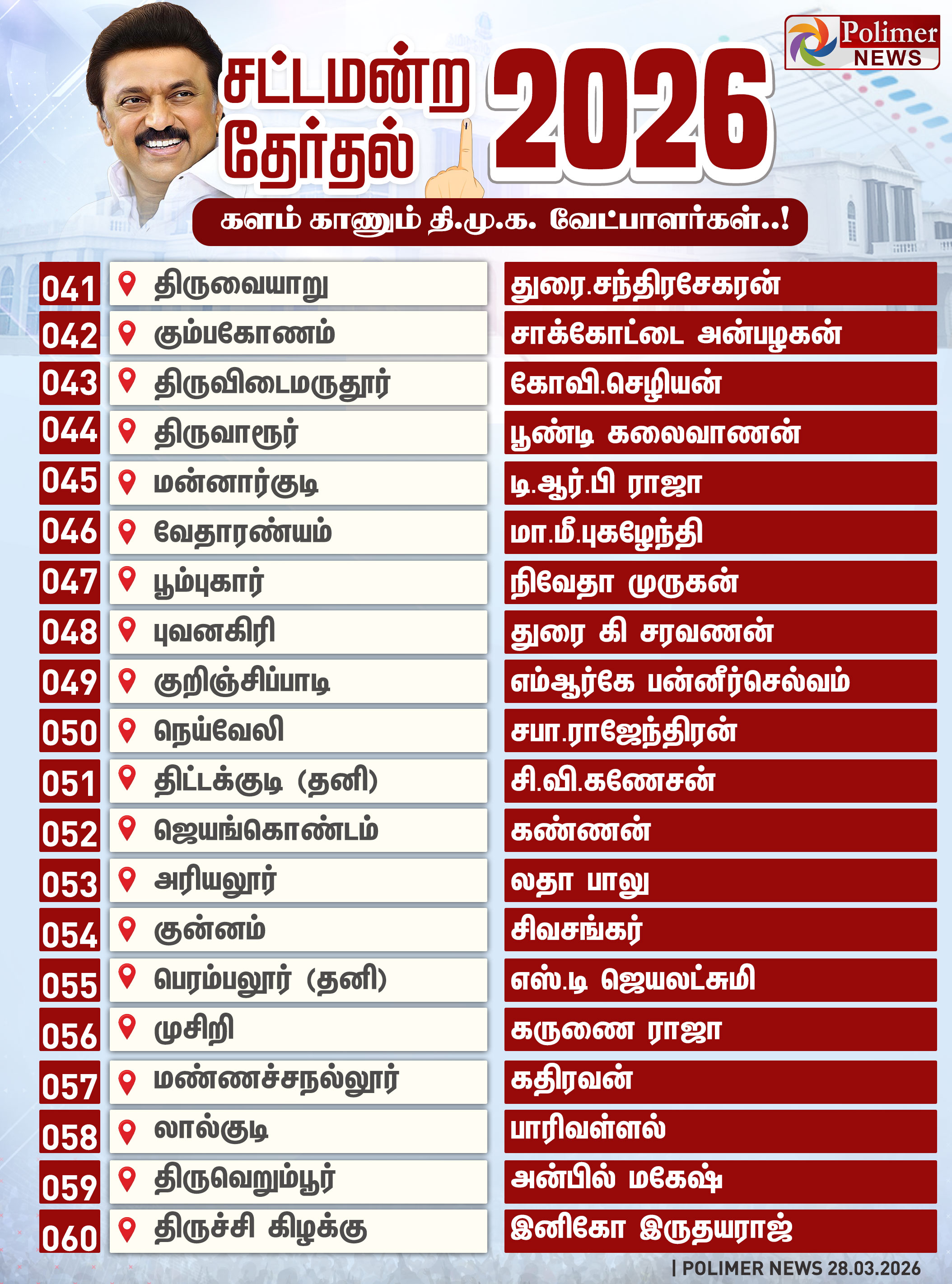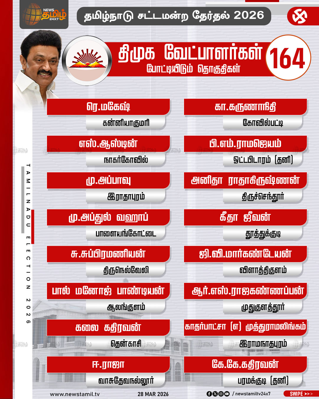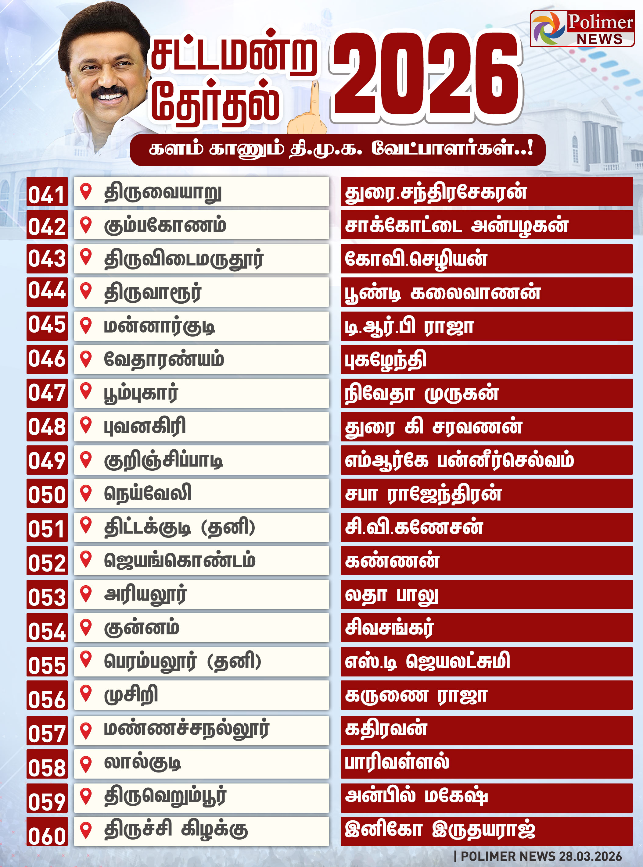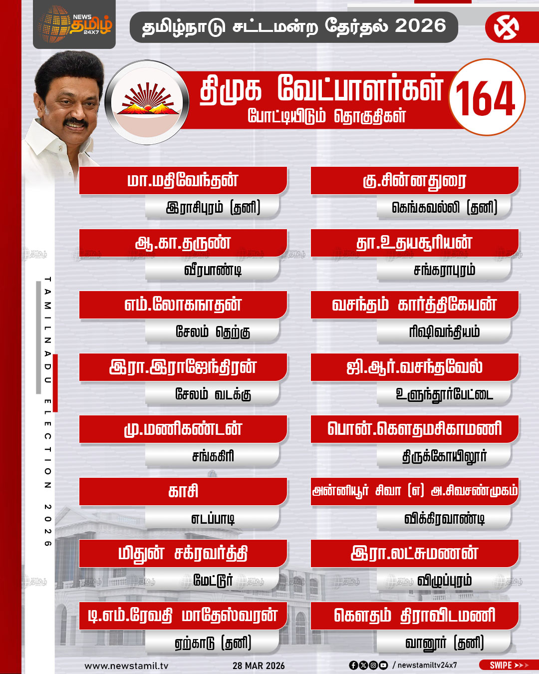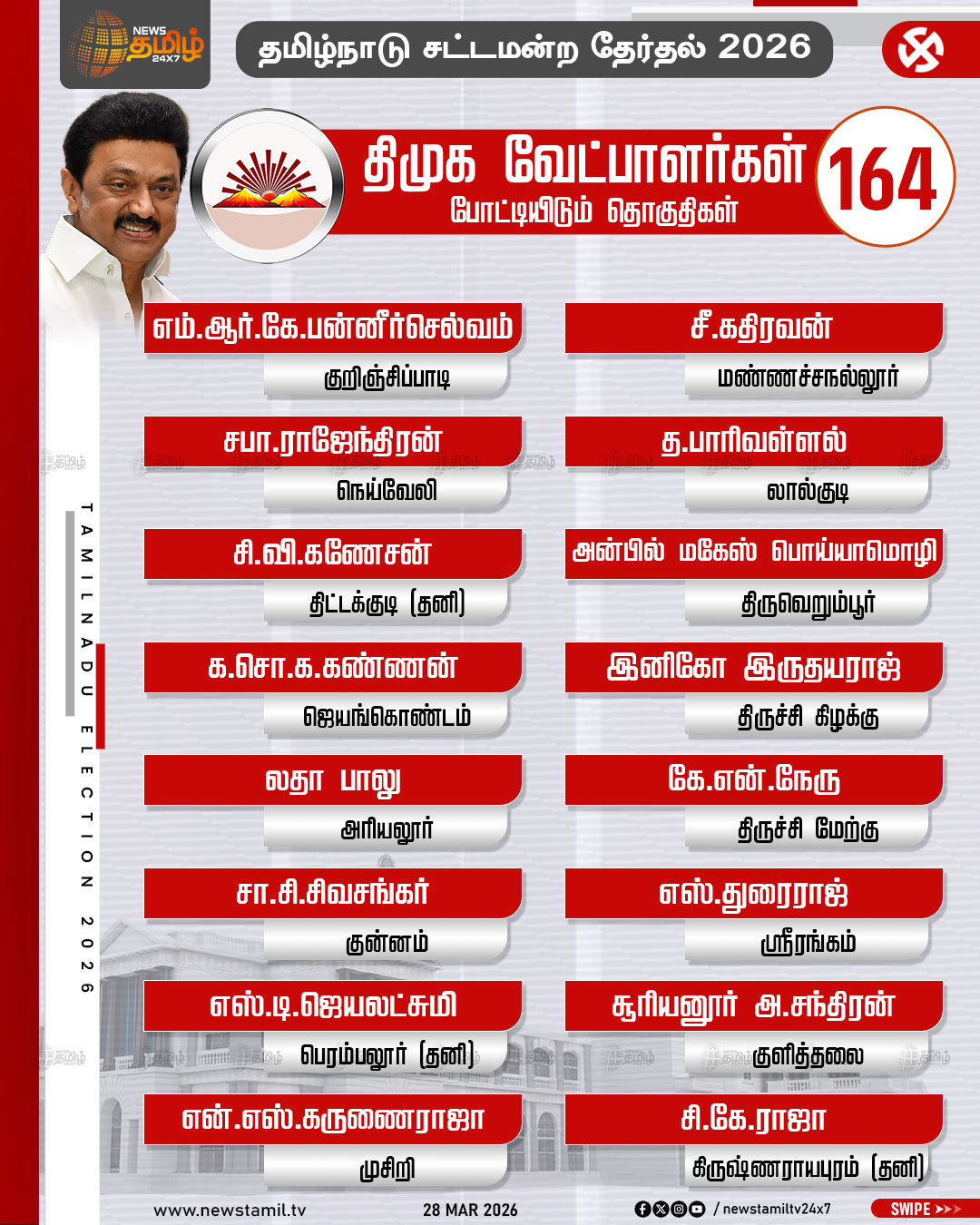 TN Election 2026 | தமிழக சட்டமன்ற தேர்தலில் திமுக போட்டியிடும் தொகுதிகள் மற்றும் வேட்பாளர்கள் பட்டியல் விவரம்..!