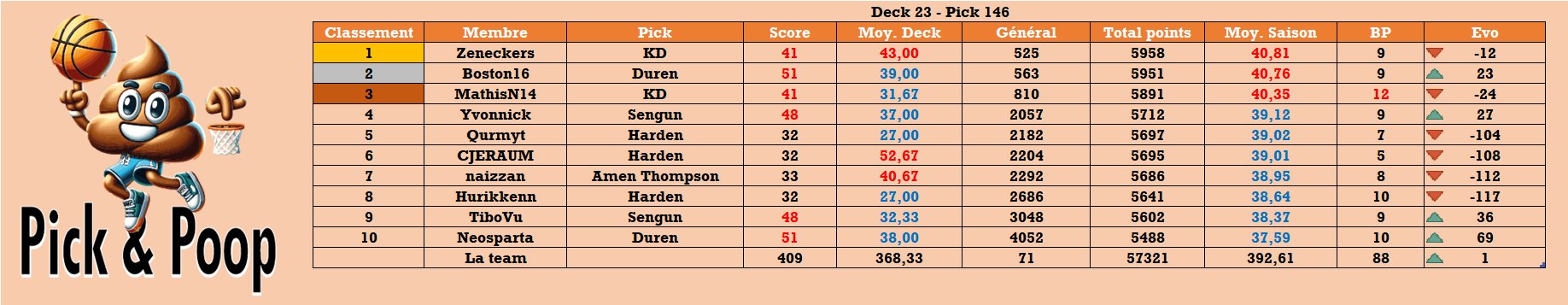 Pick&Poop #TTFL 🐪❤️ @pickandpoop · 23h Résumé de la nuit #TTFL Deck 23 - Pick 146 Top pick : Duren - 51 pts Hell pick : 🤷♂️ Total : 409 Meilleure évolution :@SpartaMVP📈+69 Classement : @🥇 @juchoupo@🥈 @Boston16TTF@L 🥉 @MathisN14 Général : 71📈3bYK3Nb 1 2 31
