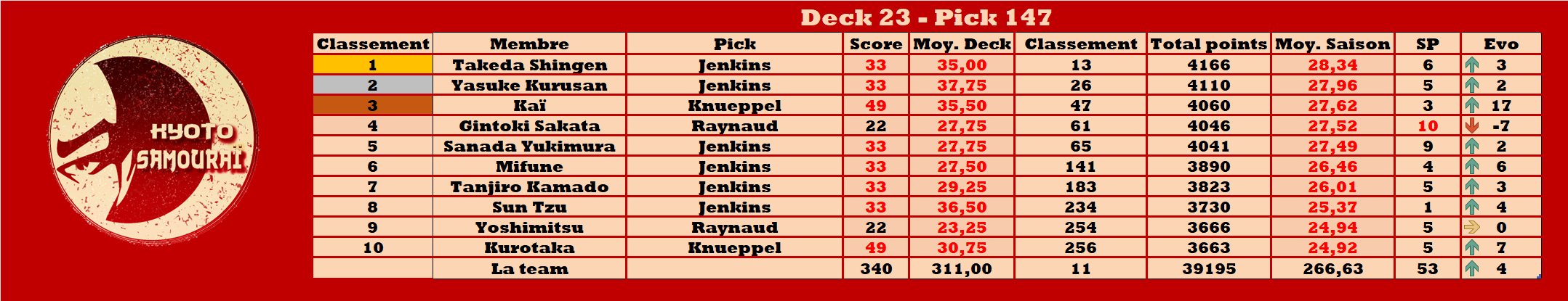 Kyoto Samouraï TTFL 🐪🐉❤️ @KyotoTTFL · 16h Résumé de la nuit #TTFL @LigueExoticTTFL Deck 23 - Pick 147 SP🧉: Knueppel - 49 pts 🥇 BP🍌: 🤷♂️ Total : 340 Meilleure évolutio@n : @Kai_Ronin_TTFL📈+17 Classement @: 🥇 @TakedaShinge@n23 🥈 @_Yasuke_Kur@usan 🥉 @Kai_Ronin_TTFL Classement team : 11PSupii9s3 1 20