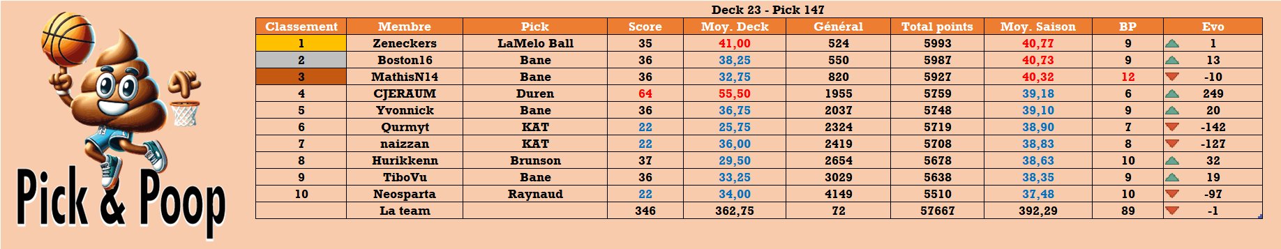 Pick&Poop #TTFL 🐪❤️ @pickandpoop · 16h Résumé de la nuit #TTFL Deck 23 - Pick 147 Top pick : Duren - 64 pts 🥇 Hell pick : KAT / Raynaud - 22 pts Total : 346 Meilleure évolution :@Jegrome_📈+249 Classement : @🥇 @juchoupo@🥈 @Boston16TTF@L 🥉 @MathisN14 Général : 72📉gk7DcqM 1 3 30