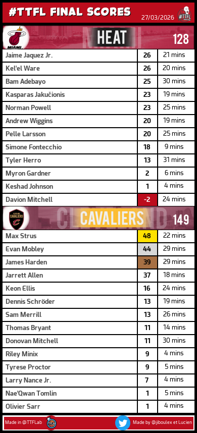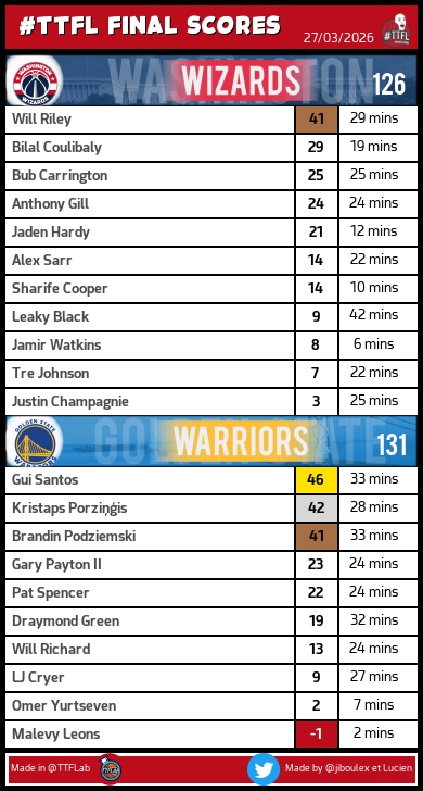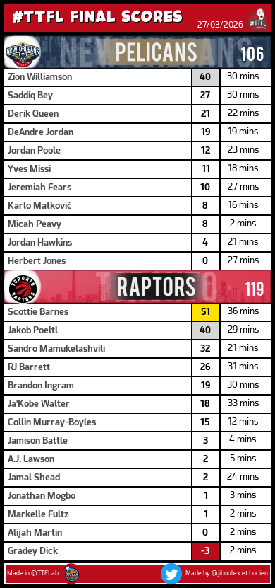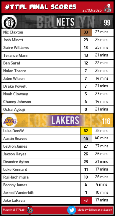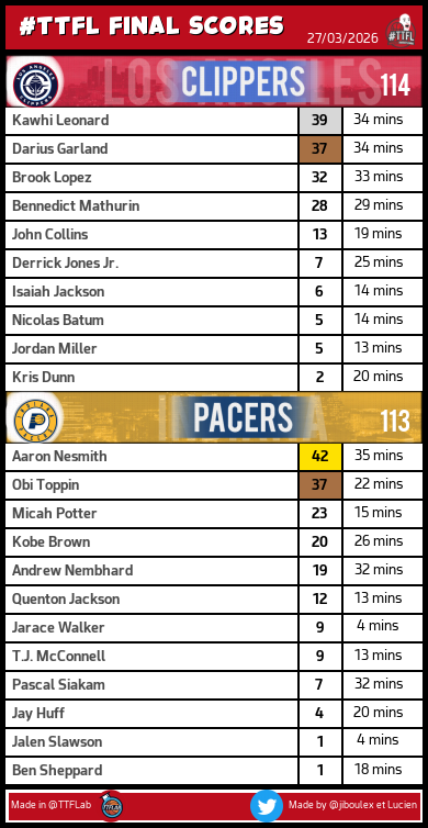DubNation TTFL @DubNationFrTTFL · 4h Récap Pick 148 #TTFL: - 1 Johnson: 43pts - 1 Flagg: 36pts - 6 Sengun: 30pts - 1 James: 27pts - 1 Donovan: 11pts avec 1 bonus Total: 308pts 1 32