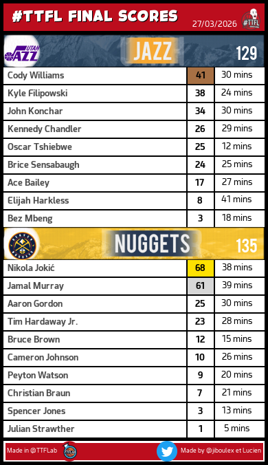 TrashTalk Fantasy Lab @TTFLab · 5h Best picks en #TTFL cette nuit : - Nikola Jokić : 68 pts - Luka Dončić : 62 pts - Jamal Murray : 61 pts #NBA 2 17 2.6K