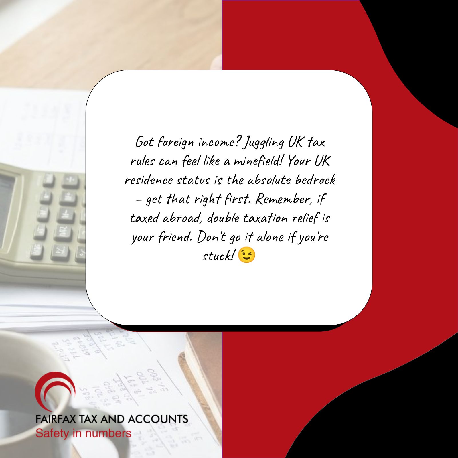 Got foreign income? UK tax rules can be tricky! Your residence status matters, and don’t forget about double taxation relief. Fairfax Tax and Accounts can help simplify the process. 😉 #TaxHelp