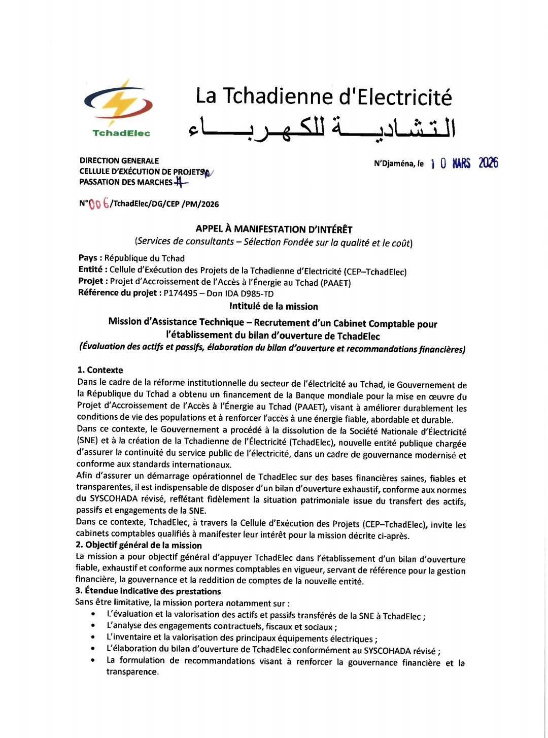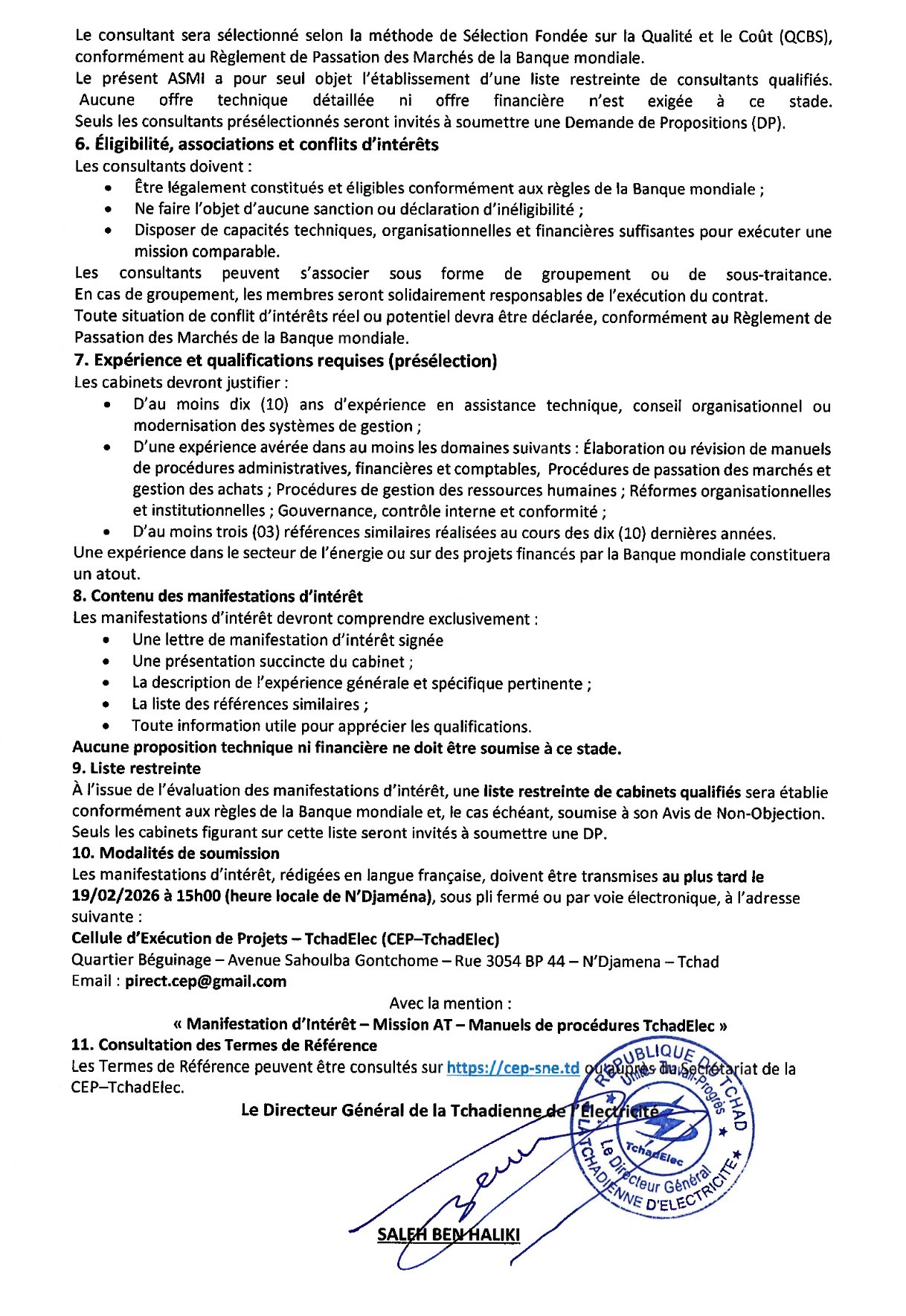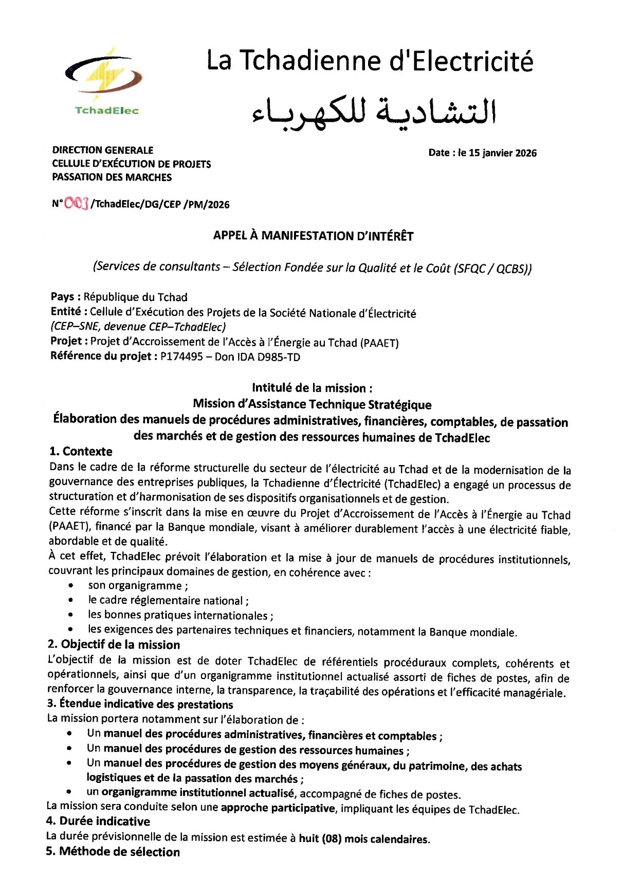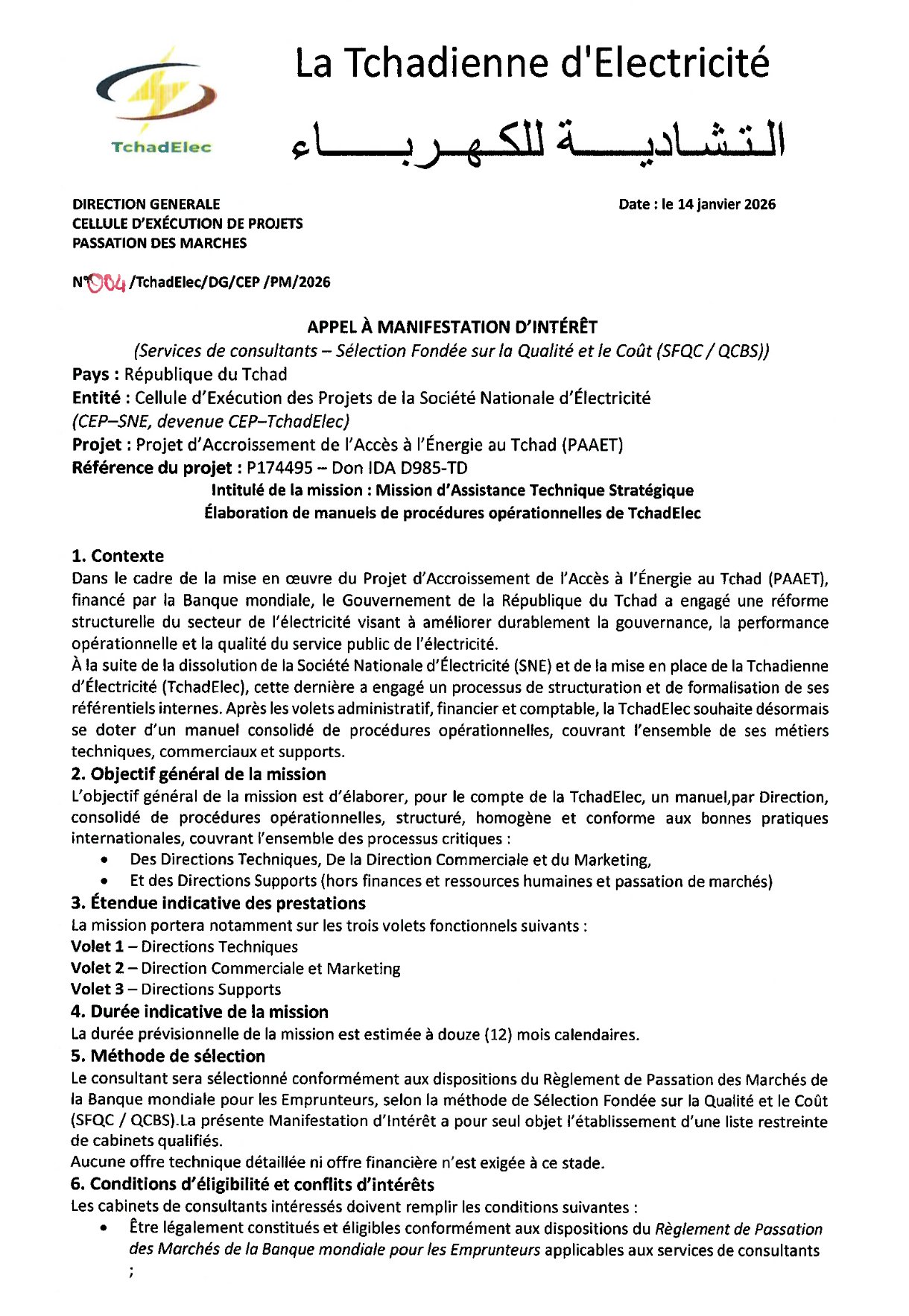 #QCBS (Qualité et Coût). À ce stade, seules les manifestations d’intérêt sont attendues. Les dossiers, rédigés en français, doivent parvenir au plus tard le 19 février 2026 à 15h00 (heure de N’Djaména) à l’adresse de la CEP–TchadElec, par courrier ou par email à pirect.cep@gmail.com, avec la mention obligatoire : « Manifestation d’Intérêt – Mission AT – Manuels de procédures TchadElec ».