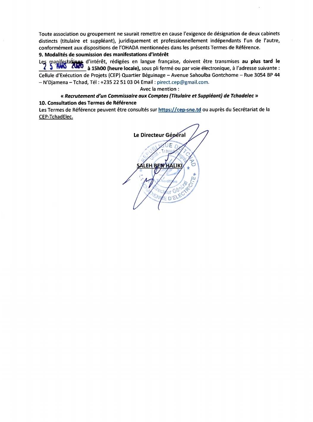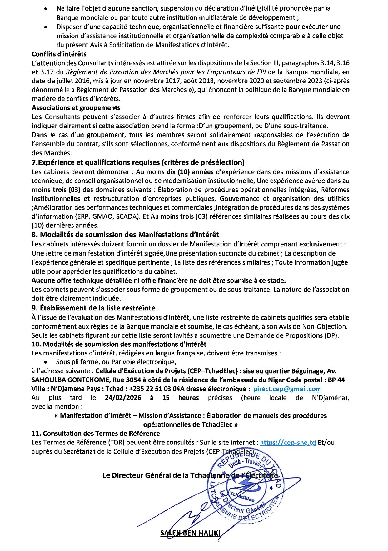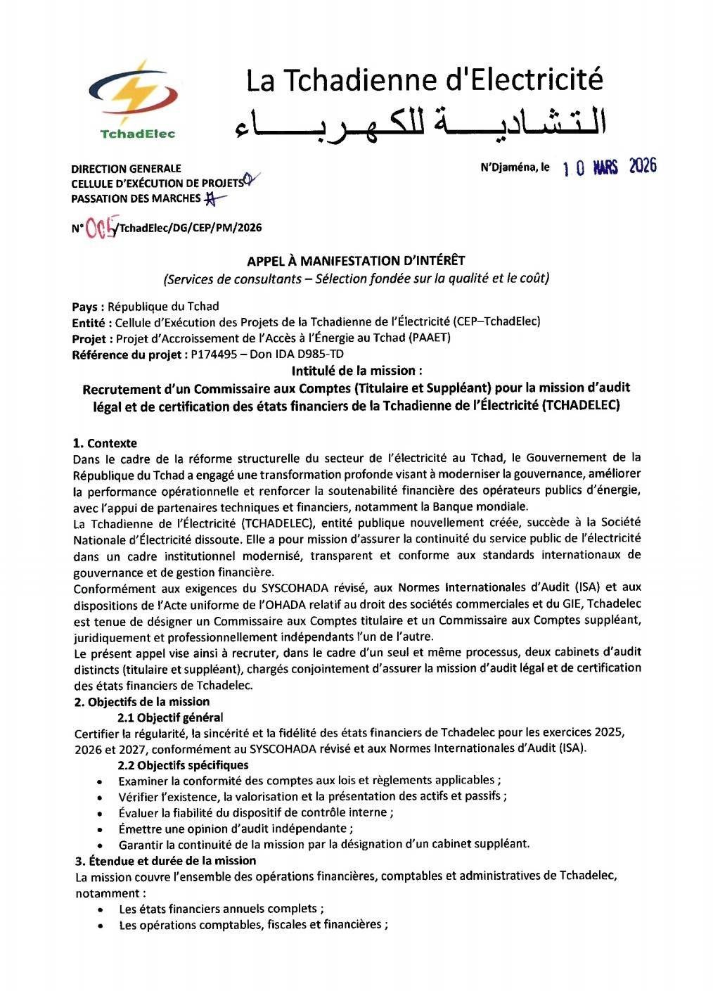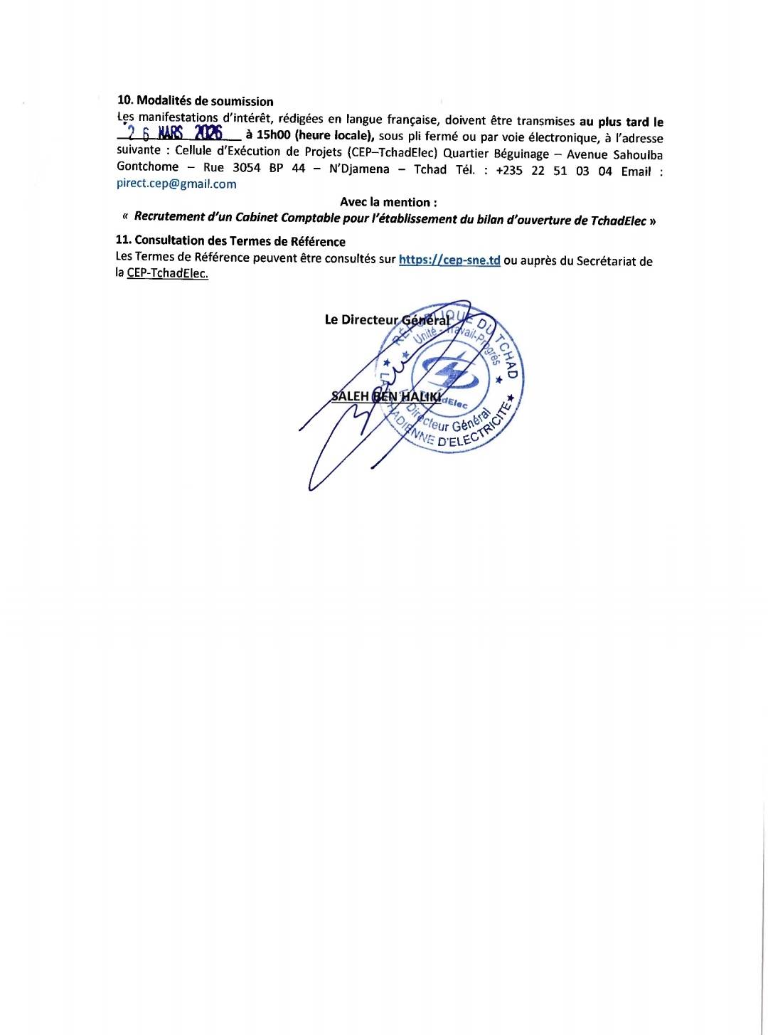 #QCBS (Qualité et Coût). À ce stade, seules les manifestations d’intérêt sont attendues. Les dossiers, rédigés en français, doivent parvenir au plus tard le 19 février 2026 à 15h00 (heure de N’Djaména) à l’adresse de la CEP–TchadElec, par courrier ou par email à pirect.cep@gmail.com, avec la mention obligatoire : « Manifestation d’Intérêt – Mission AT – Manuels de procédures TchadElec ».