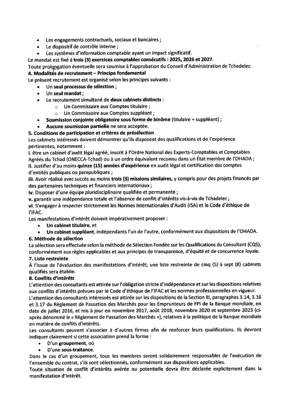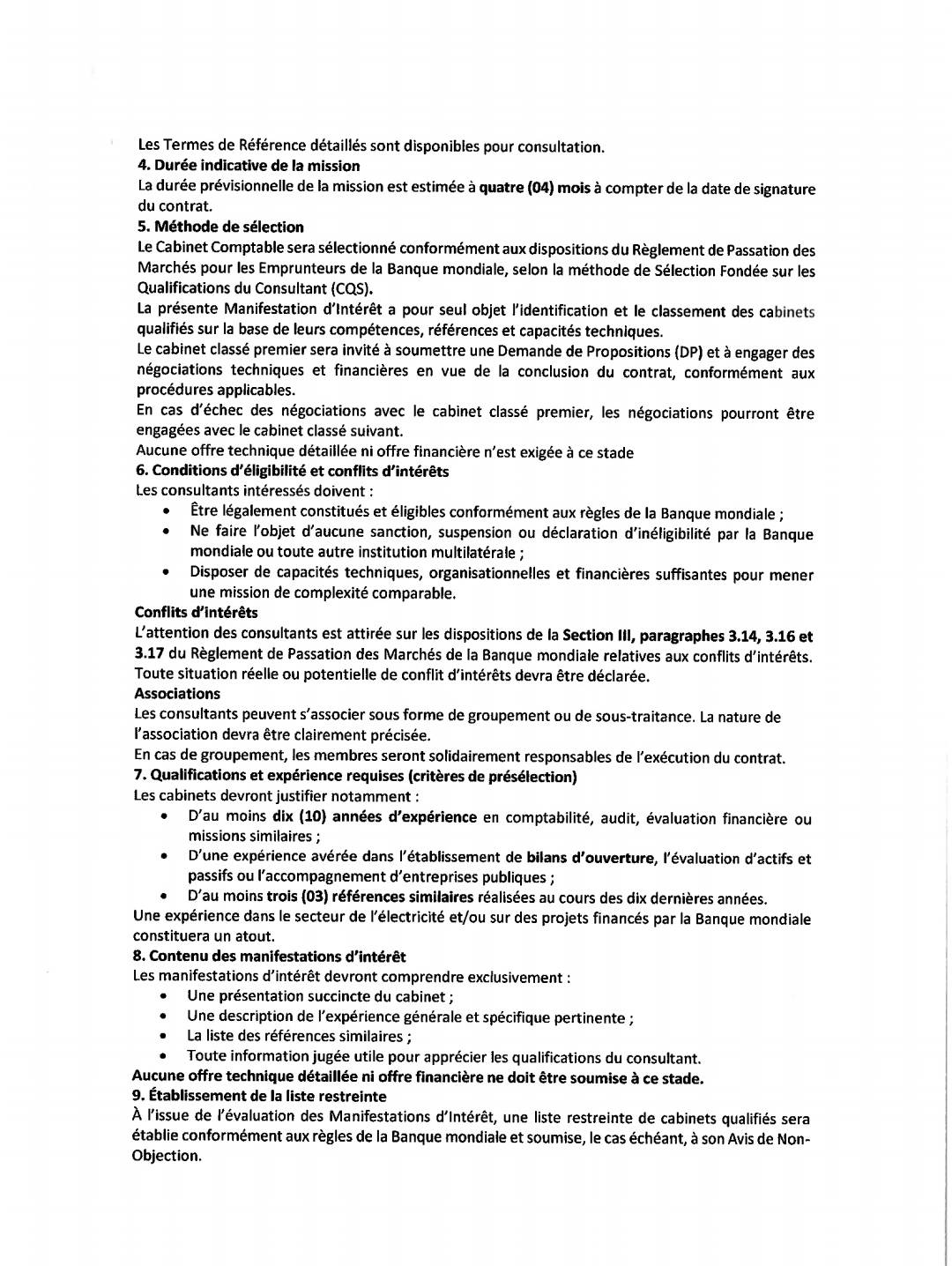 cep-sne.td. Seuls les cabinets présélectionnés seront ensuite invités à soumettre une proposition détaillée.