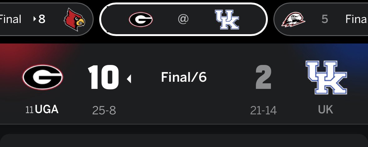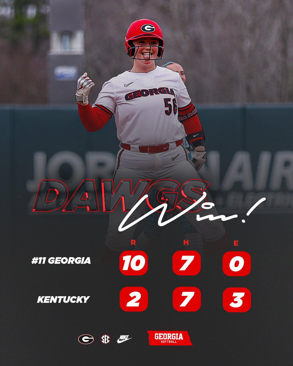 No. 11 Georgia defeats Kentucky, 10-2 (6 inn.), to kick off the series in Lexington. The Bulldogs are back tomorrow afternoon at 2:00 p.m. ET for game two of the series!