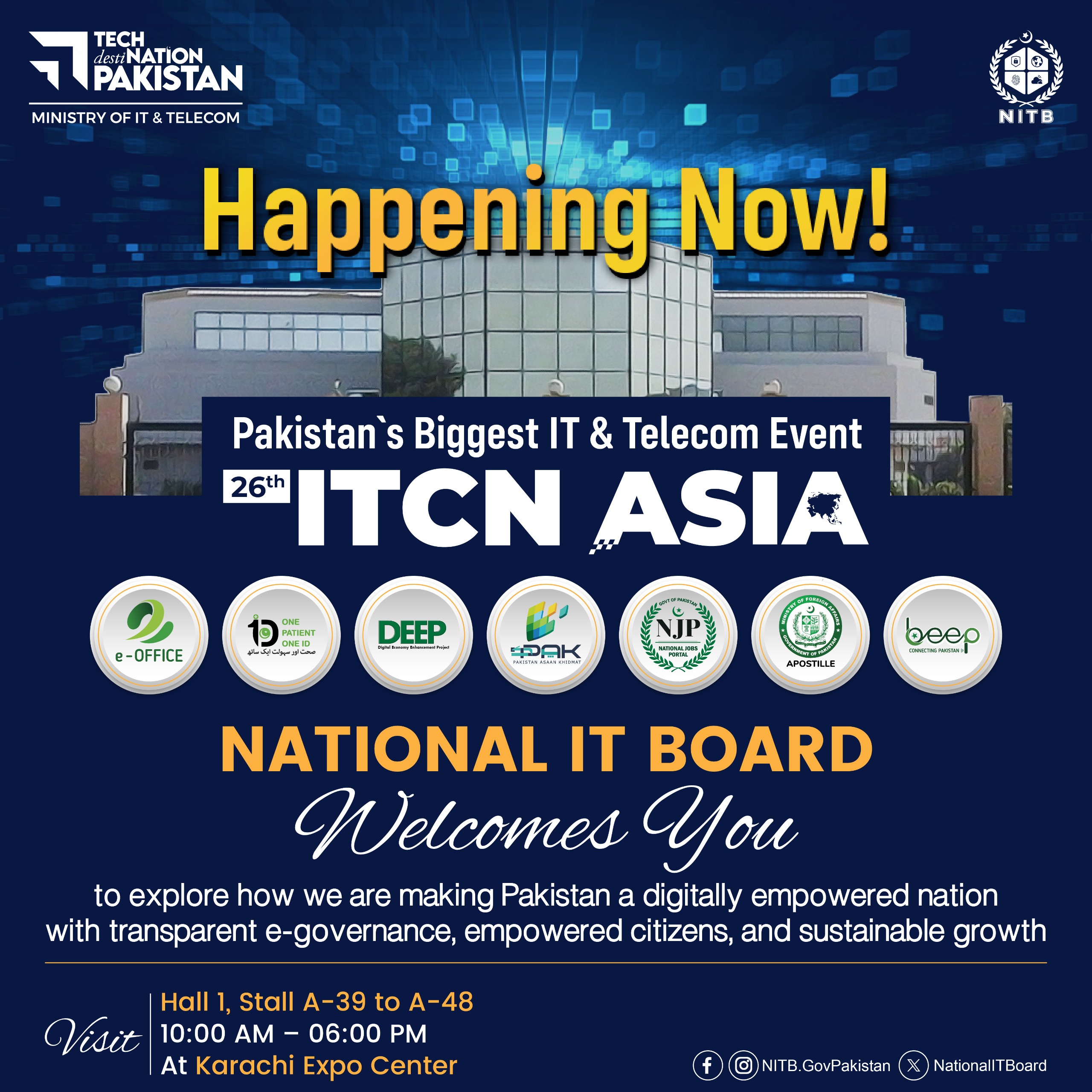 National Information Technology Board (NITB) @NationalITBoard · Sep 23, 2025 Happening Now! Pakistan’s biggest IT & Telecom event, 26th #ITCNA2025 is LIVE! Visit us at Hall 1, Stall A-39–A-48 | 10 AM–6 PM Explore e-Governance, citizen-first services & innovations powering Digital Pakistan! #TechDestination #DigitalNationPakistan #MoITT #NITB 1 2 278