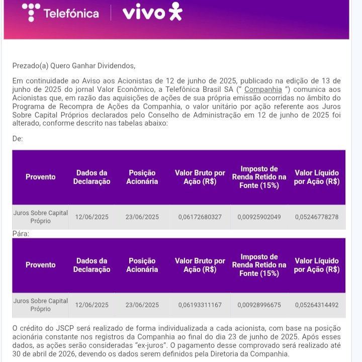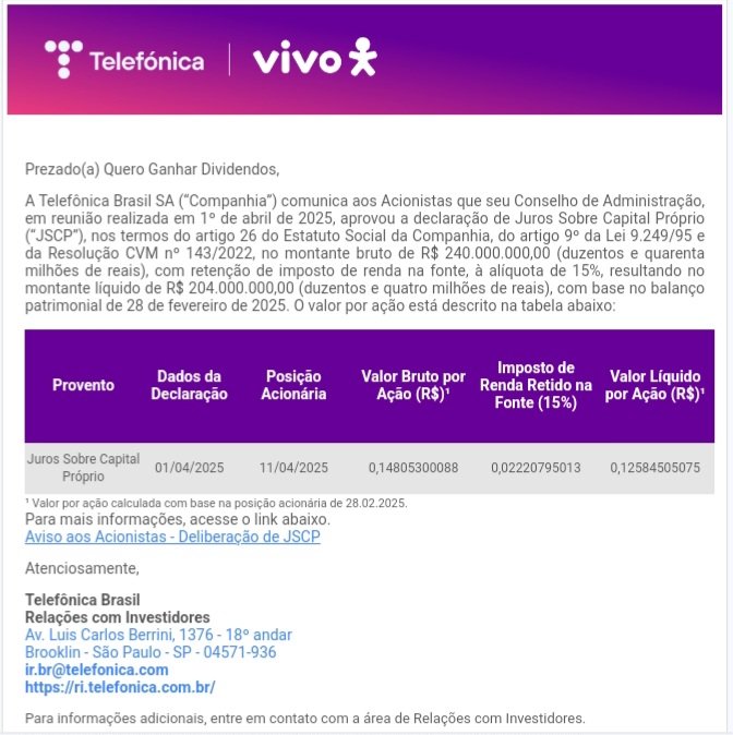 Telefônica Brasil anuncia pagamento de Dividendos!!!#Queroganhardividendos #TelefonicaBrasil #VIVO #VIVT3 #Dividendos #JCP #Proventos