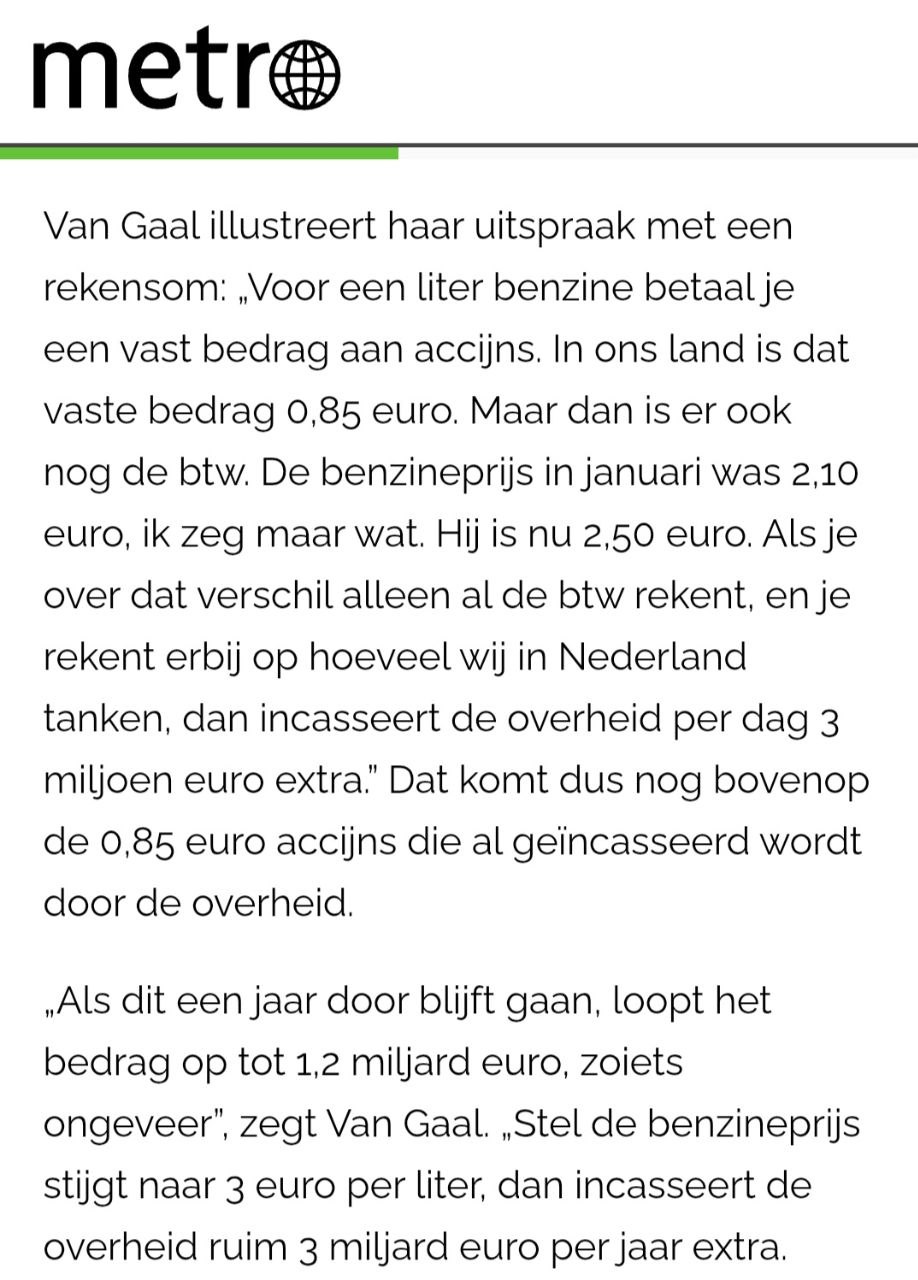 De #Metro: er zit al €0,85 accijns in de prijs 1 liter benzine, maar over het gehele bedrag (dus ook deze accijns) wordt nog eens 21% belasting gerekend.