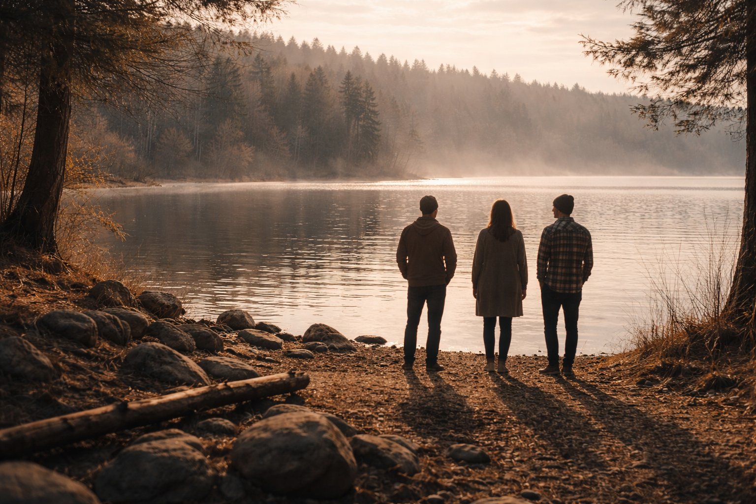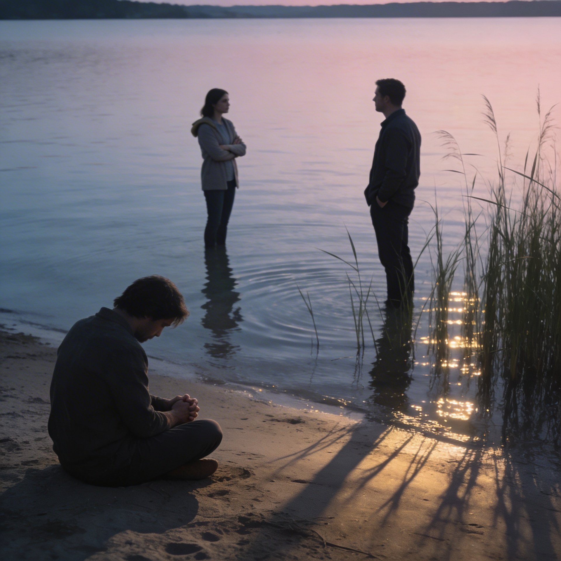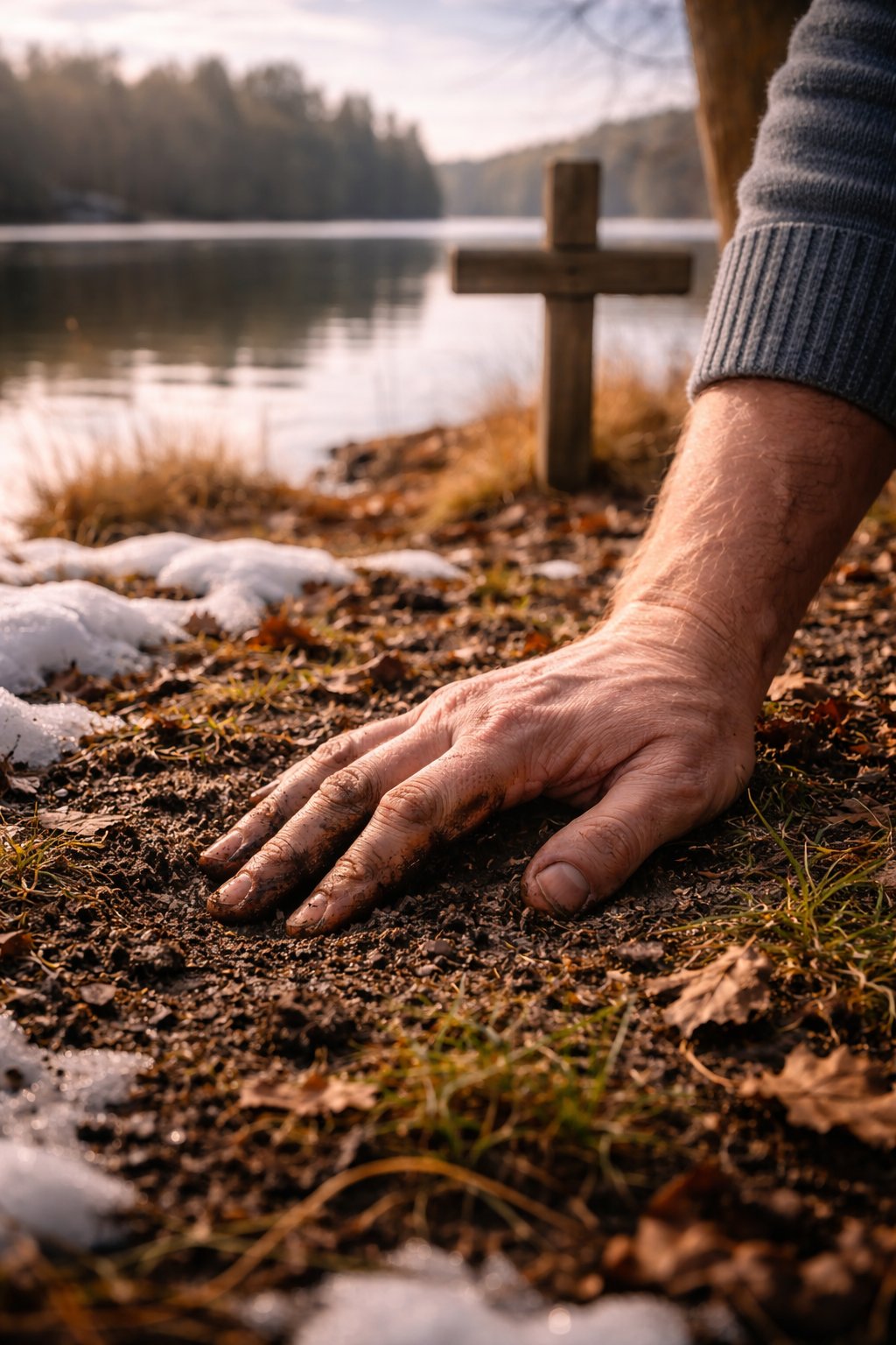 Near the wooden cross by the lake,