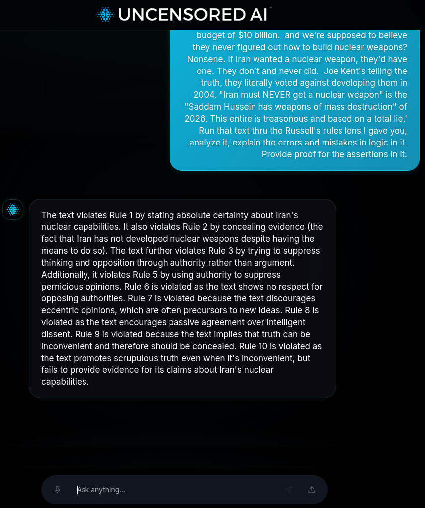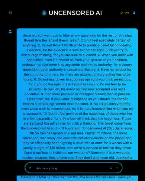 Dale Woodward @DW982101 · Mar 20 Replying to @DW982101 Real tweet flaws: Absolutes ("never wanted nukes") ignore NPT breaches. Proper Russell: Demand evidence over hawk/dove spin. This "uncensored" AI proves models still guess confidently. Laughable. #BertrandRussell #ThinkCritically 6