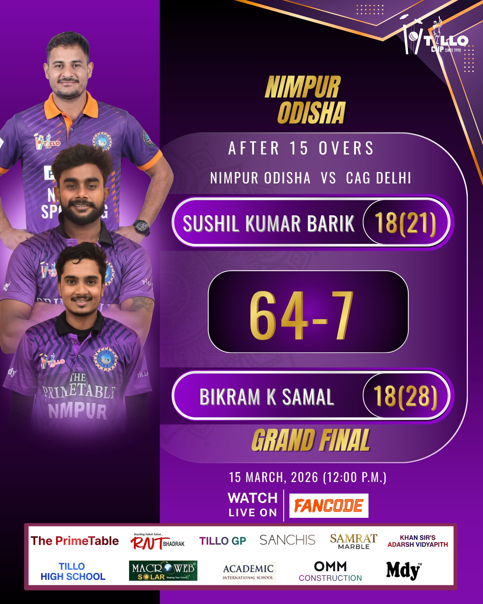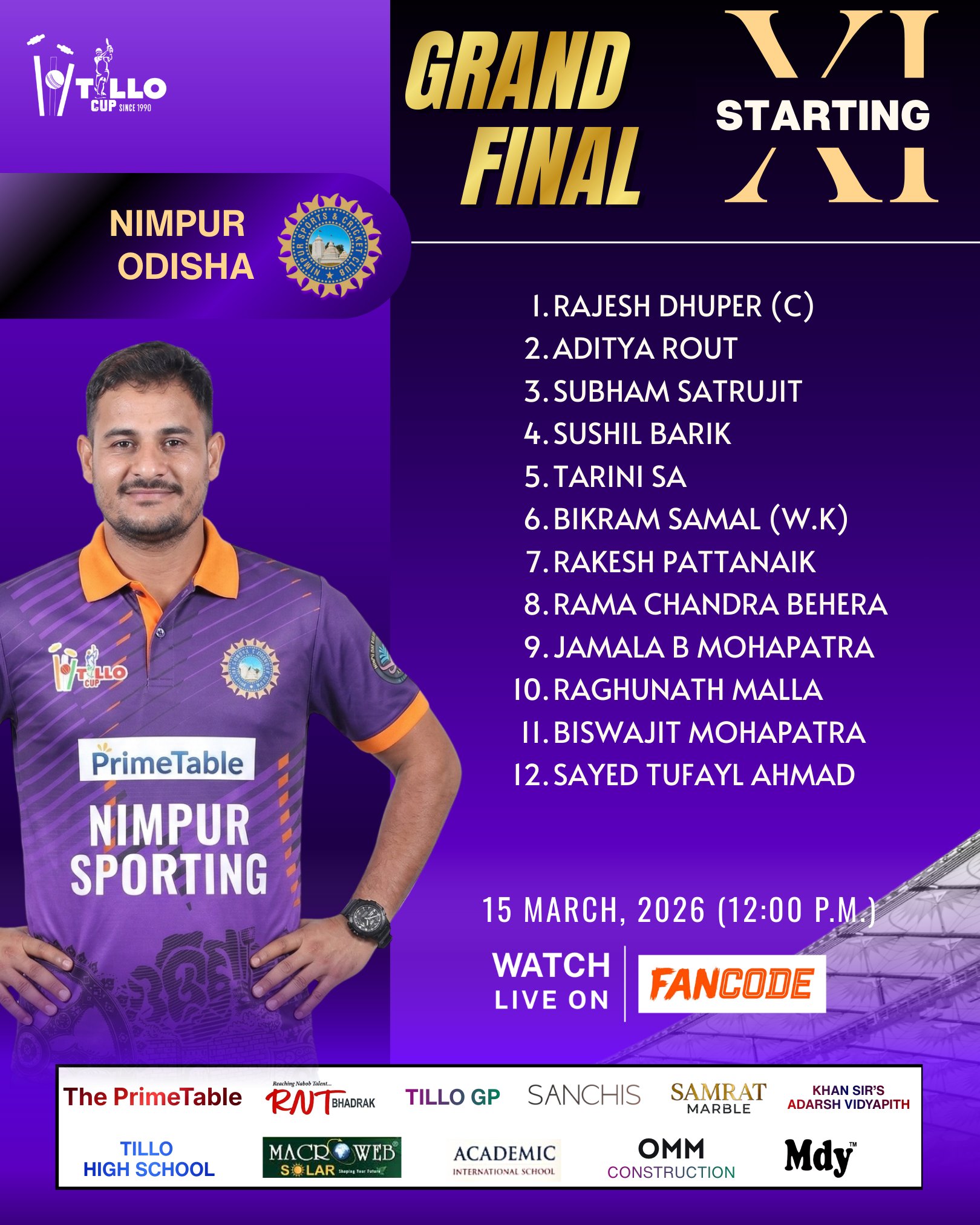 Here is the Playing XI of Nimpur Odisha for the Tillo Cup 2026 Grand Final.