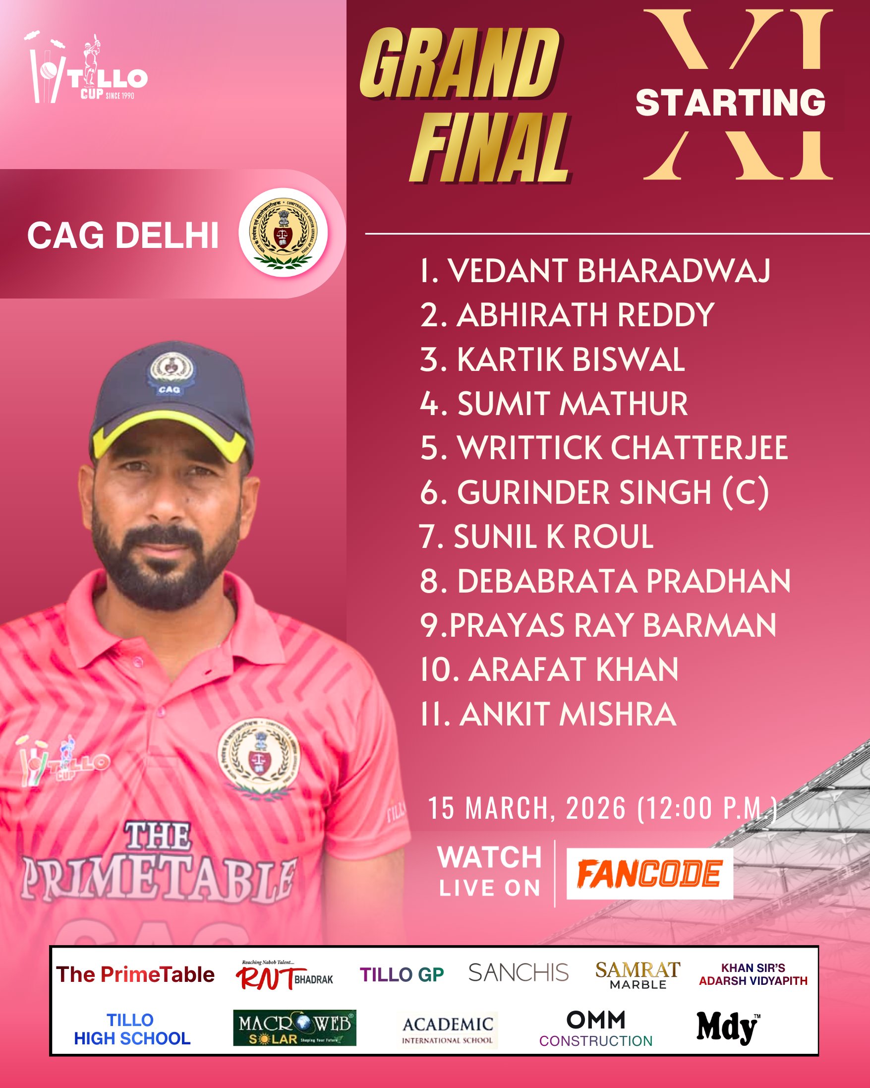 Presenting the Playing XI of CAG Delhi for the Tillo Cup 2026 Grand Final.