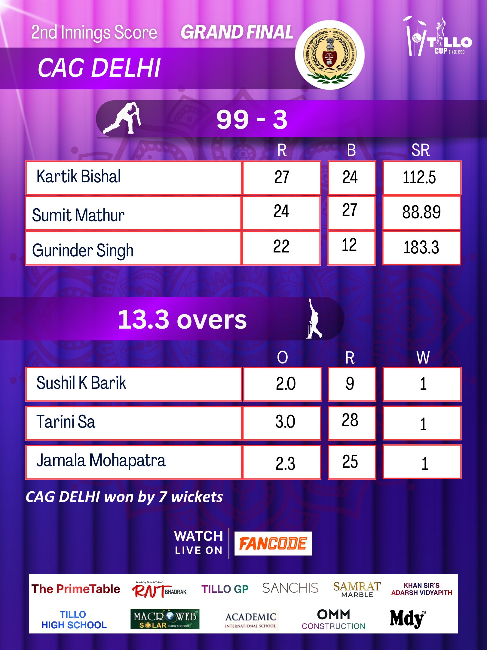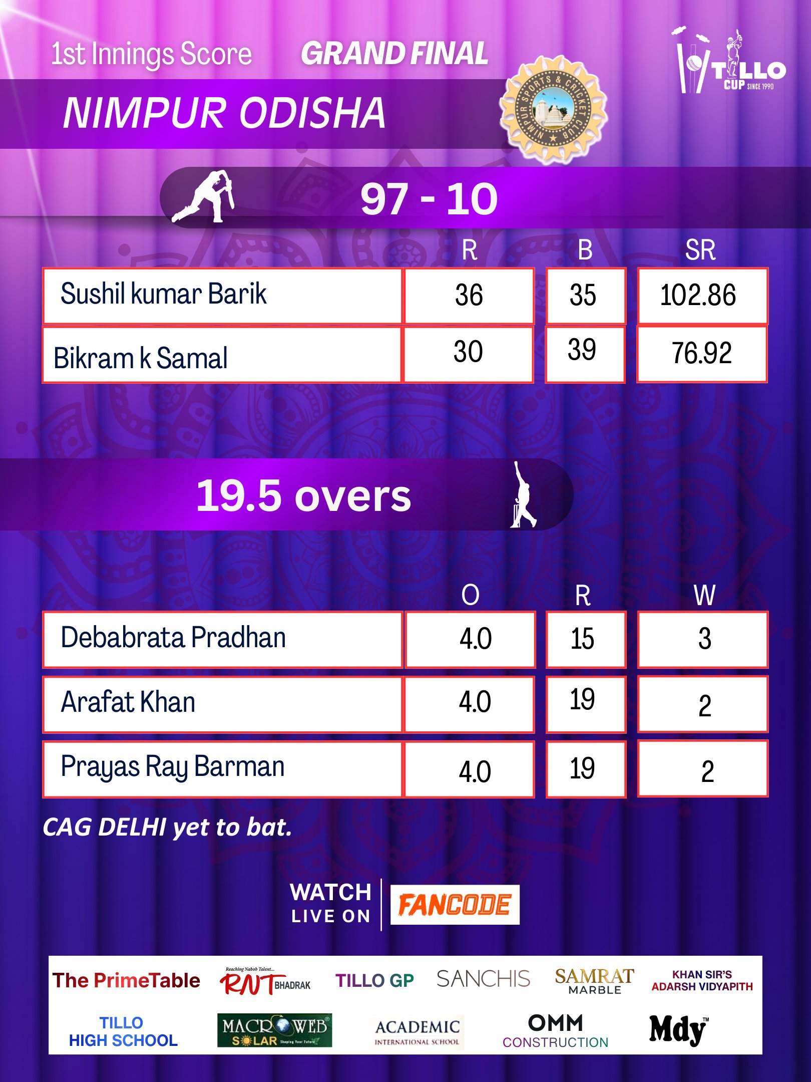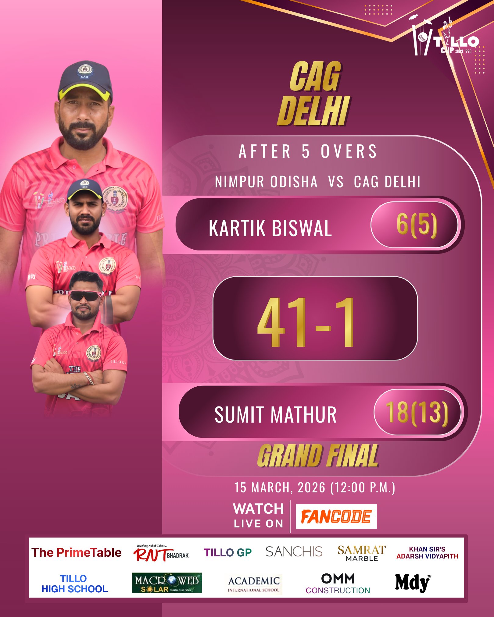 CAG Delhi defeat Nimpur Odisha by 7 wickets to win the Tillo Cup 2026 Grand Final.