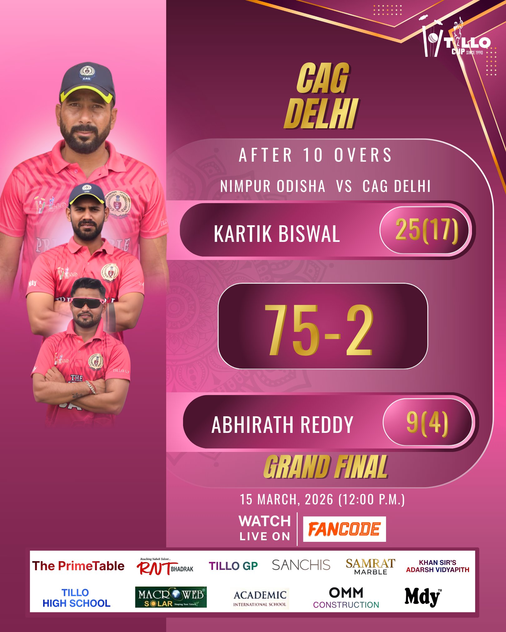 After 10 overs, CAG Delhi are 75/2 while chasing 98 in the Tillo Cup 2026 Grand Final.