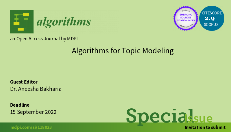 Algorithms MDPI @Algorithms_MDPI · Apr 18, 2022 New #specialissue #Algorithms for #TopicModelin Editor: Dr. Aneesha Bakharia from The University of Queensland mdpi.com/journal/algori… #mdpialgorithms via @MDPI 1 1