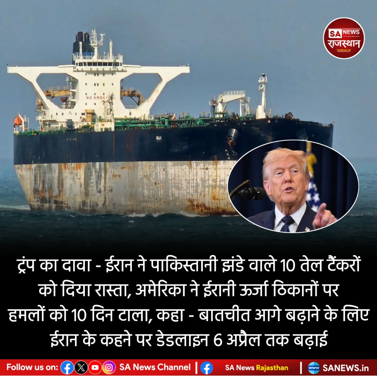 News:- ट्रंप का दावा- ईरान ने पाकिस्तानी झंडे वाले 10 तेल टैंकरों को दिया रास्ता, अमेरिका ने ईरानी ऊर्जा ठिकानों पर हमलों को 10 दिन टाला, कहा- बातचीत आगे बढ़ाने के लिए ईरान के कहने पर डेडलाइन 6 अप्रैल तक बढ़ाई