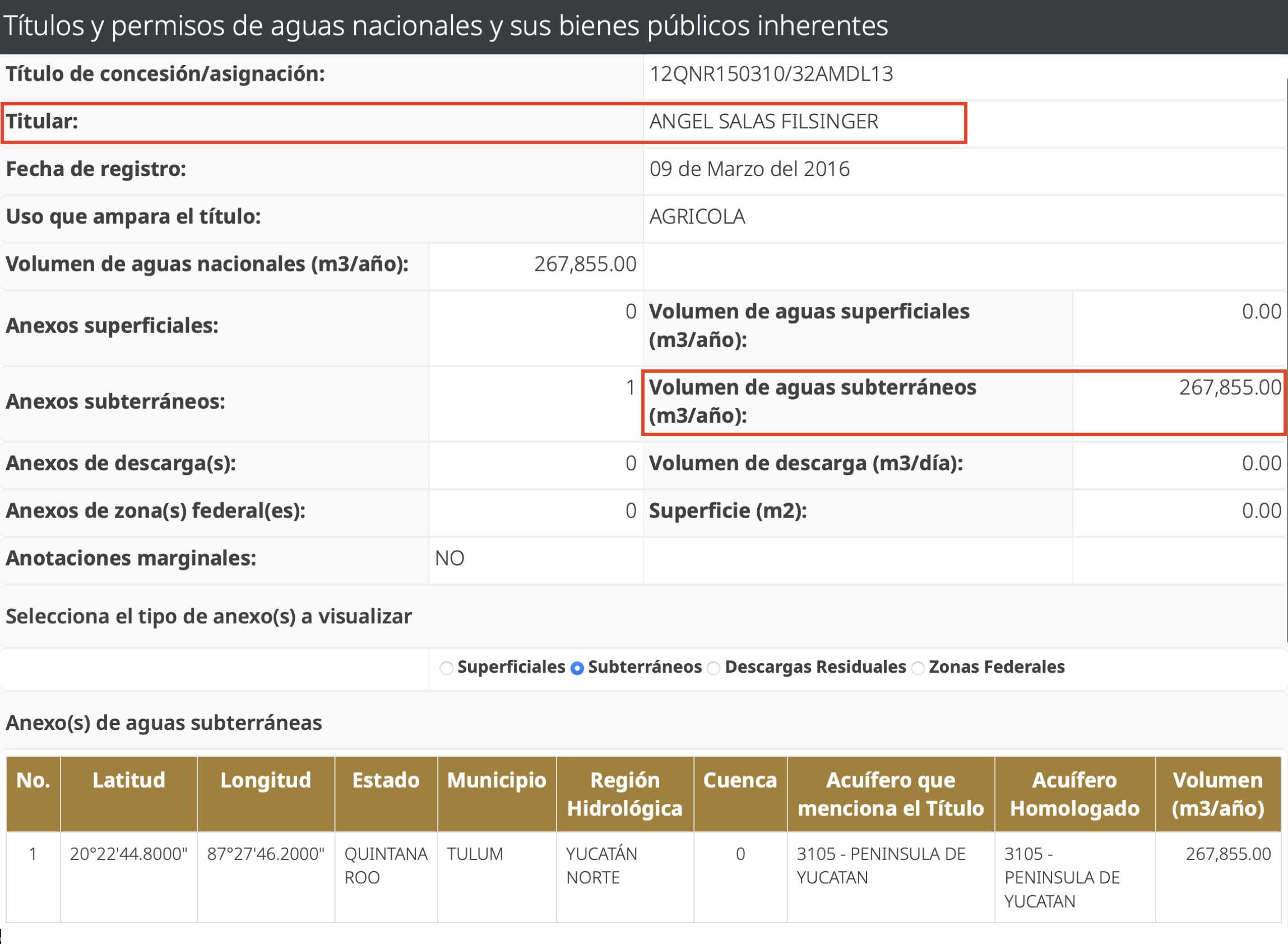 Salas Filsinger cuenta con el título de concesión 12QNR150310/32AMDL13, el cual le permite extraer hasta 267,855 metros cúbicos de agua para fines agrícolas en el municipio de Tulum, Quintana Roo.