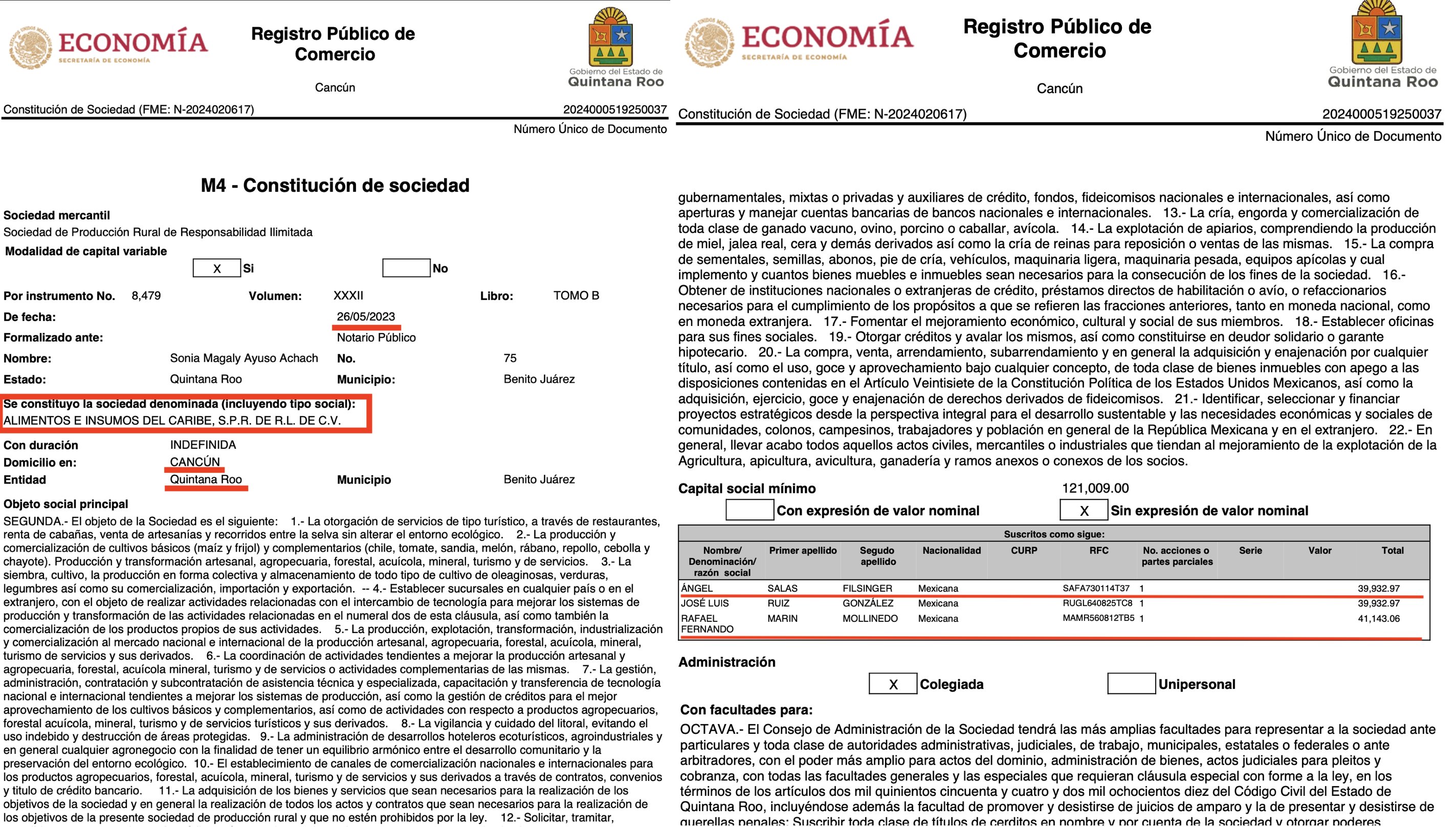 La relación entre el beneficiario de la concesión y el alto funcionario federal es documental. En mayo de 2023, Rafael Marín Mollinedo constituyó la sociedad Alimentos e Insumos del Caribe SPR de RL de CV en Cancún, Quintana Roo. En el acta constitutiva, ante la Notaría Pública 75, figuran como socios fundadores el propio Marín Mollinedo, Ángel Salas Filsinger y un tercer accionista de nombre José Luis Ruiz González.