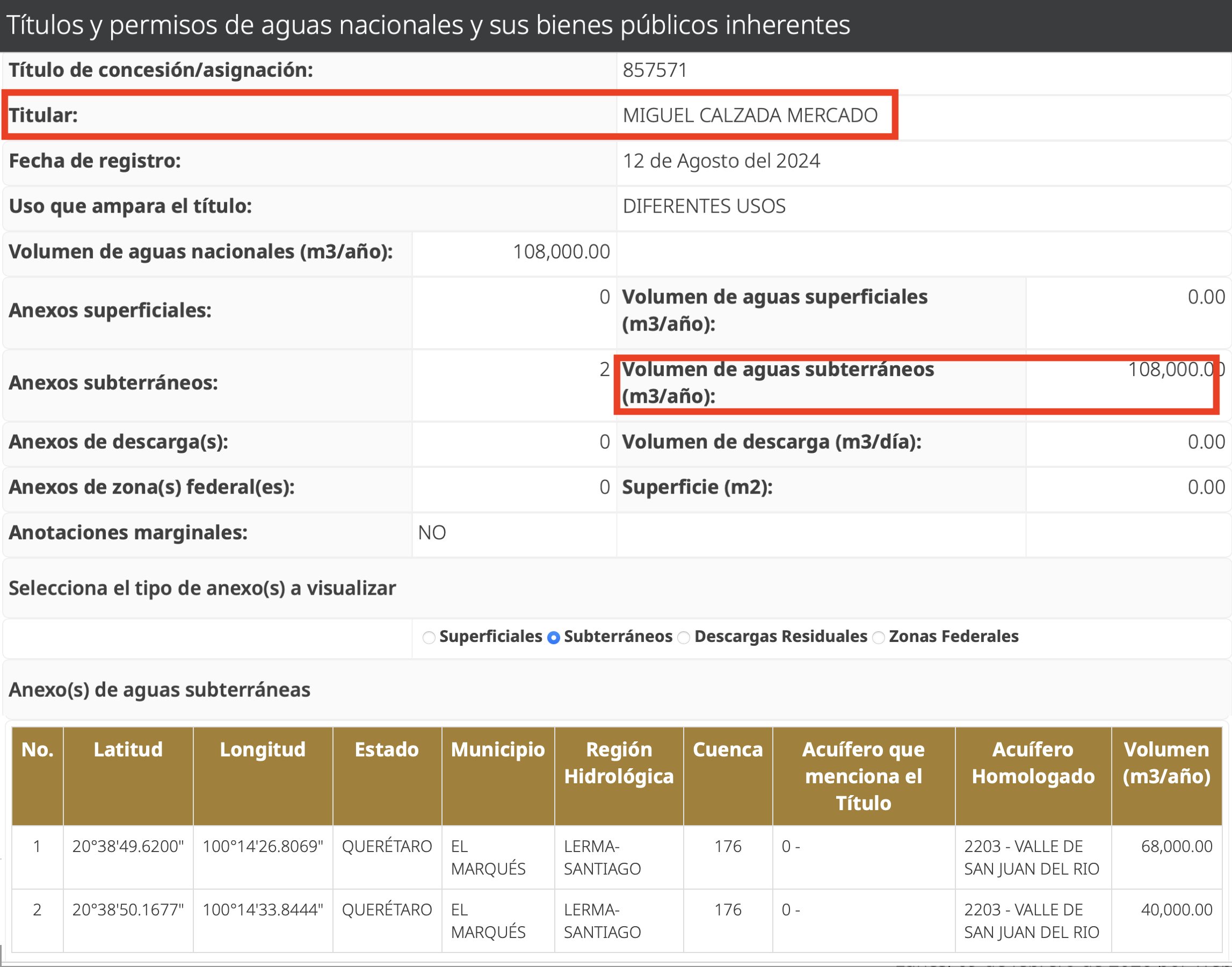 Una consulta a la base de datos del Registro Público de Derechos del #Agua (REPDA), da cuenta que la Dirección Local Conagua de Querétaro otorgó a los hermanos Calzada Mercado, los títulos de concesión 857571, para una extracción de 108 mil metros cúbicos de agua para diferentes usos en el municipio El Marqués, y el QRO102794, para la extracción de 240 mil metros cúbicos de agua para uso agrícola en el mismo municipio; por ambos títulos de concesión los hermanos podrían extraer un total de 348 mil litros de agua, que servirían para abastecer de agua a una comunidad de 10 mil habitantes durante un mes.