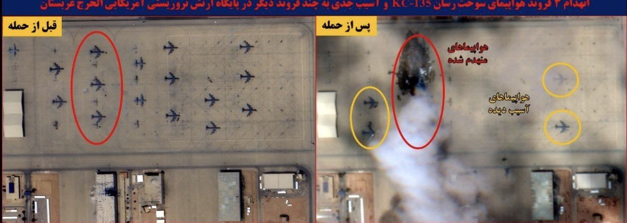 6 plus KC-135 tankers taken out on the ground, hit during predictable refuel windows, with fuel bladder parked assets igniting in sequence. timing, pattern-of-life intelligence and saturation—an object lesson in how air power is strangled