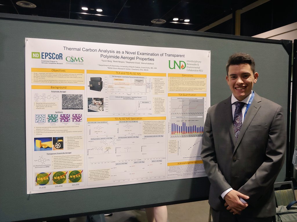 Alena Kubatova @AlenaKubatova · Apr 3, 2019 Tyson Berg #UND #Chemistry #USMASTER students presents at ACS on #REU research on polyimide gels made at NASA laboratories.