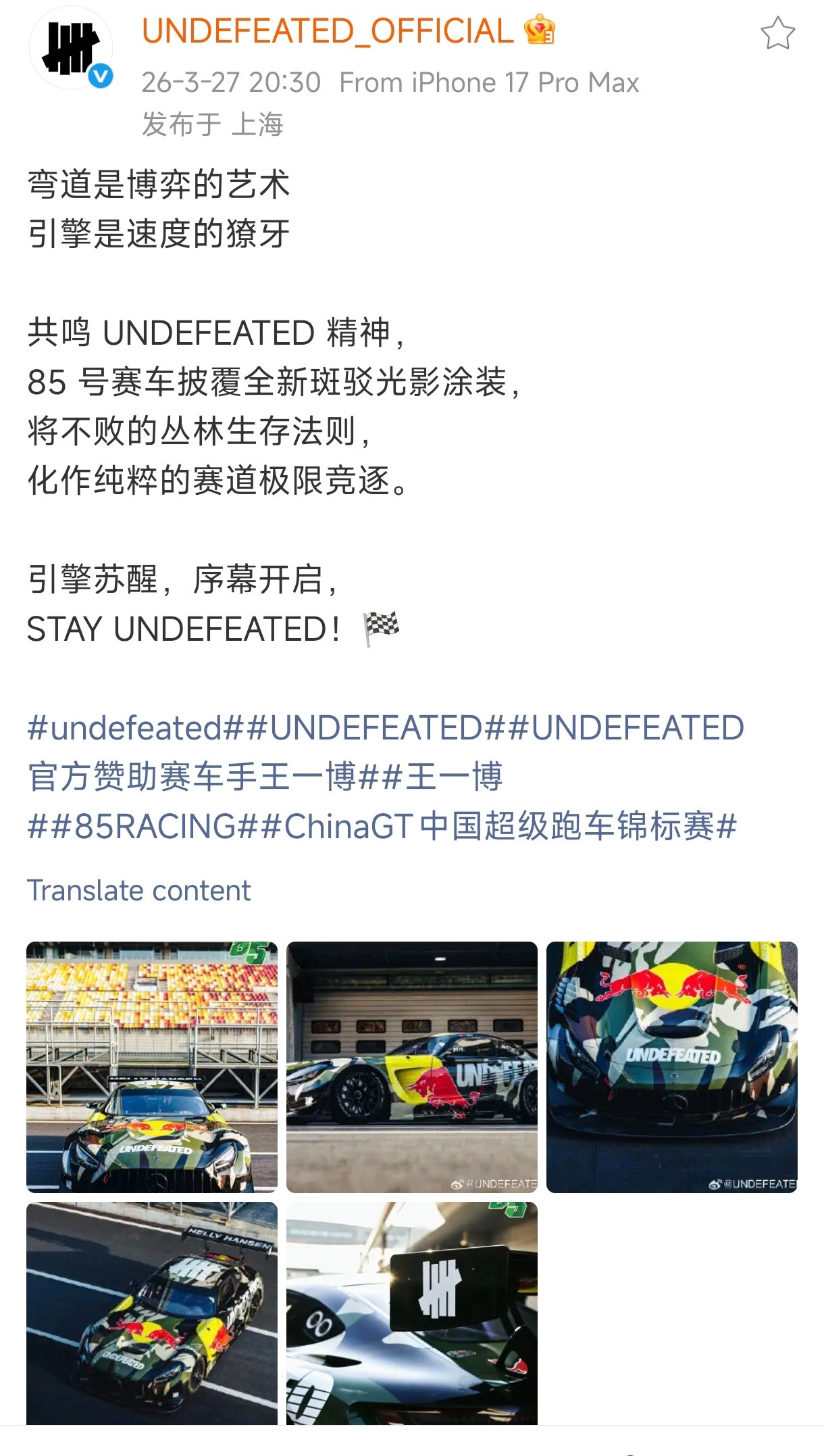 ส่วนแบรนด์ผู้รับตำแหน่งด้านแฟชั่นของ #85RACING อย่าง #Undefeated นั้นก็ไม่แปลกใจที่ #WangYibo จะเลือกตกลงกับแบรนด์สตรีทเบอร์ต้นจาก LA แล้วแบรนด์นี้ก็สปอนน้องหมีด้วยน้าาา นักแข่งที่แบรนด์สปอนหล่อๆ ทั้งนั้น 😁😁SLu