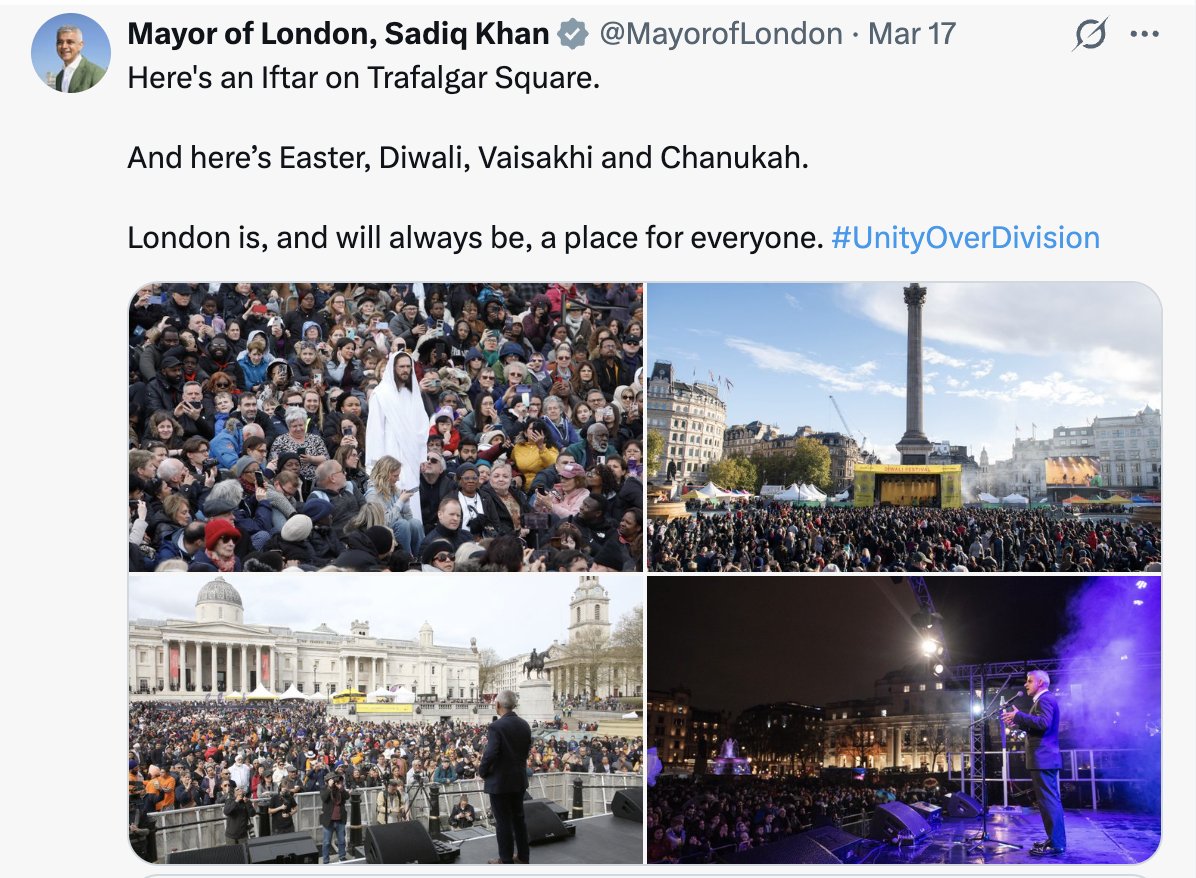 @NJ_Timothy Your interpretation is racist, ignorant, and just WRONG! Trafalgar Square has been used for various religious celebrations, Christian, Hindu, Jewish, and Muslim. (FYI, Allah is the same Abrahamic God of Christianity & Judaism). London is a diverse world city!