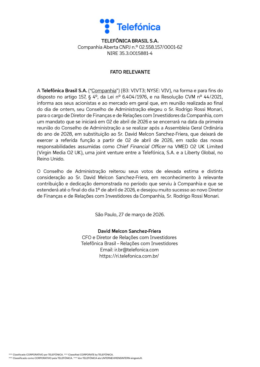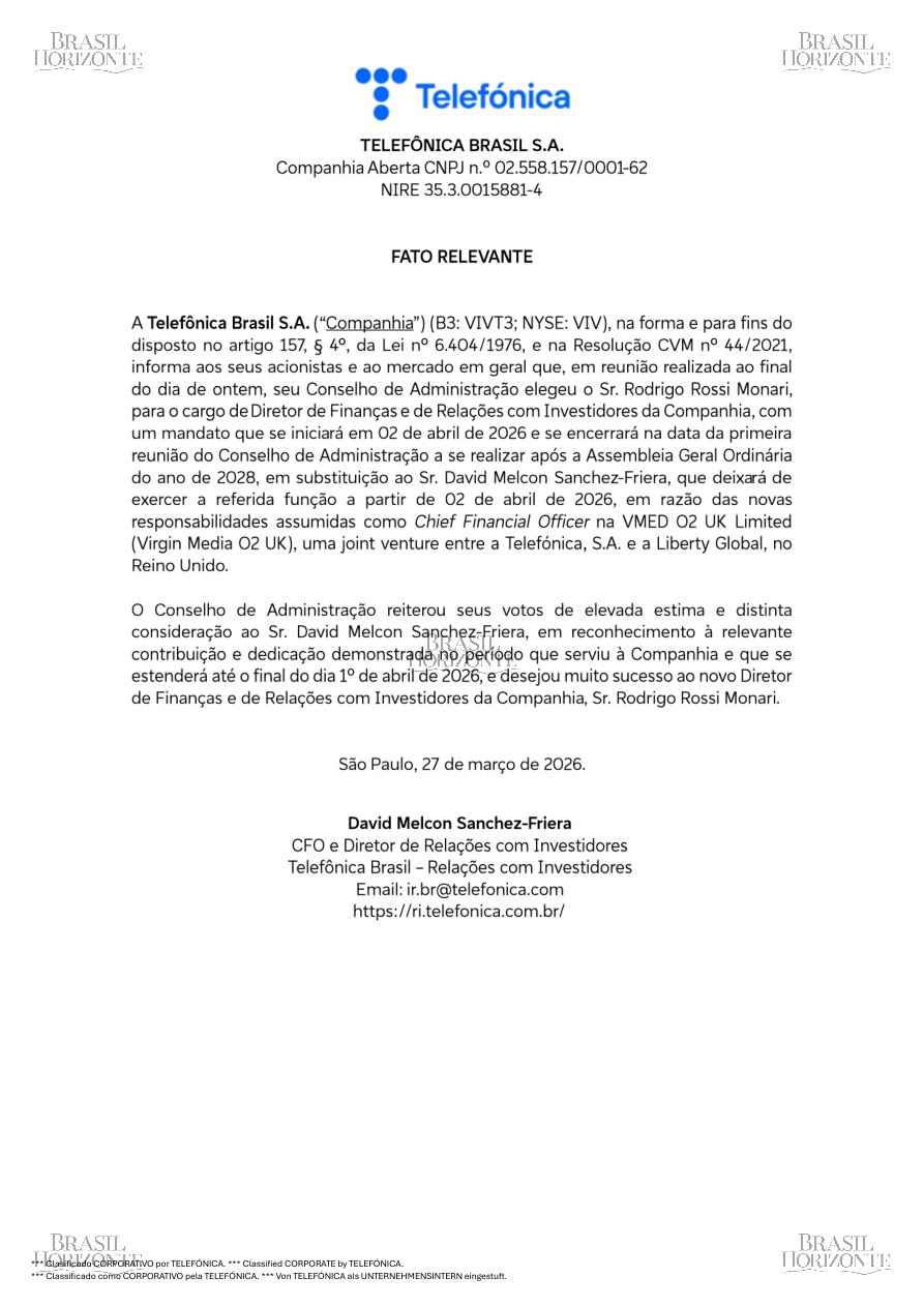 #VIVT3 #TelefonicaBrasil #RI #MercadoFinanceiro #Investimentos #MudançaDeLiderança #Finanças #B3 #Ações #NotíciasCorporativas