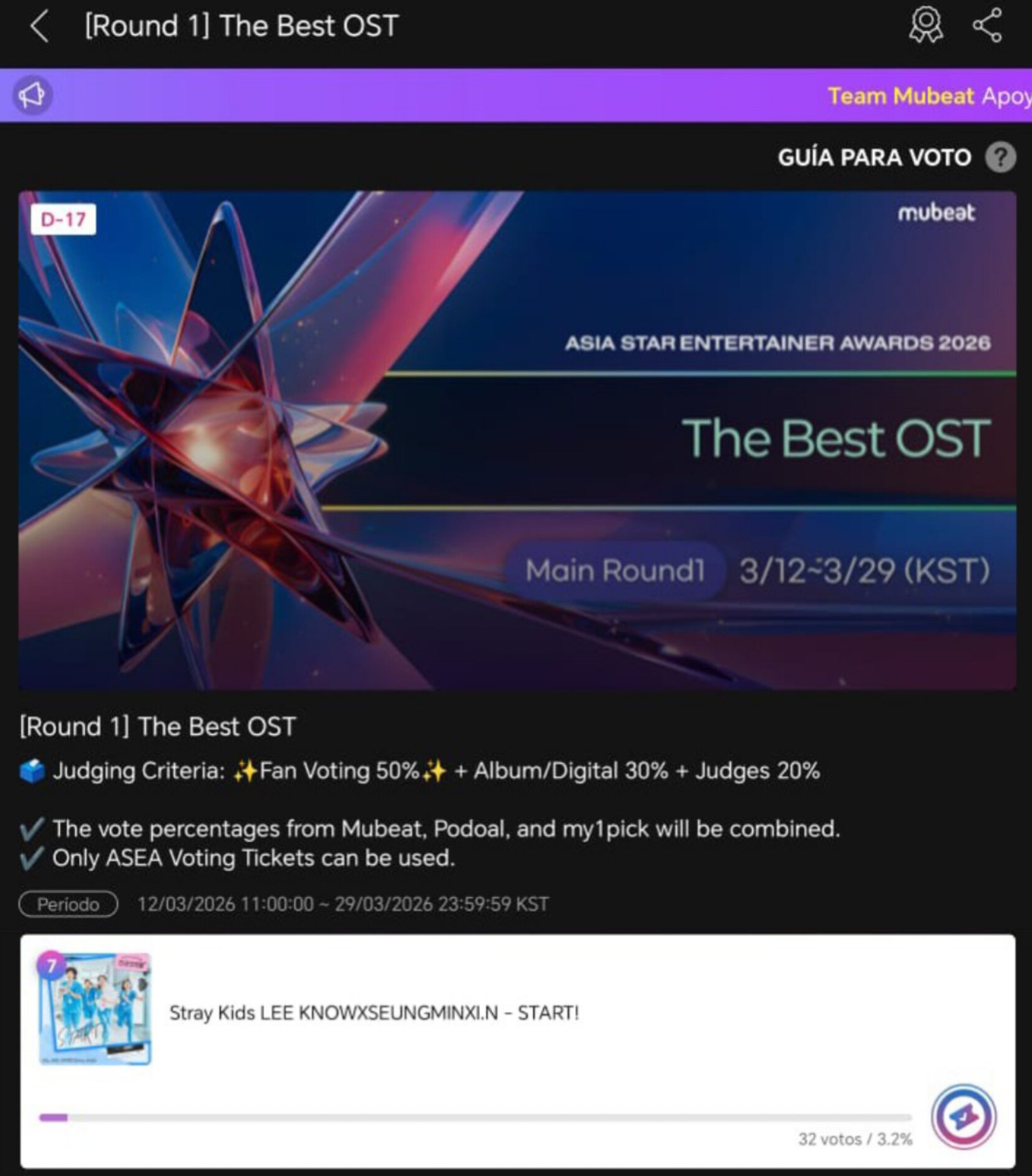 “START!” (#LeeKnow, Seungmin & I.N) foi indicada na categoria de “Melhor OST” do ASEA 2026 e 50% do peso é votação aberta ao público!
