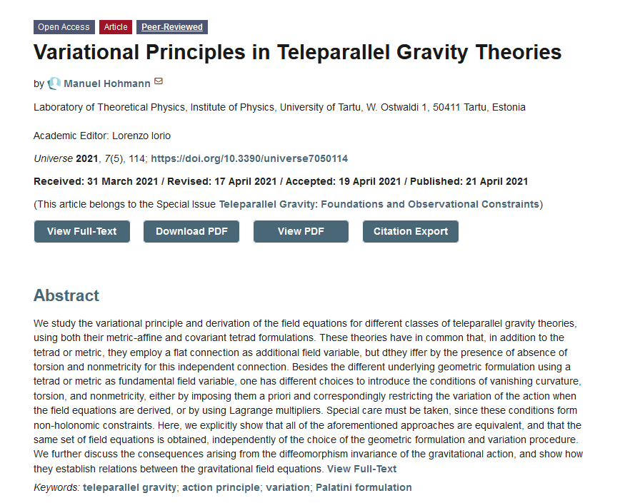 Universe MDPI @Universe_MDPI · Nov 12, 2021 #mdpiuniverse Welcome to read the article by Dr. Manuel Hohmann from University of Tartu @unitartu: #VariationalPrinciples in #TeleparallelGravityTheories mdpi.com/2218-1997/7/5/… #actionprinciple #variation #Palatiniformulation