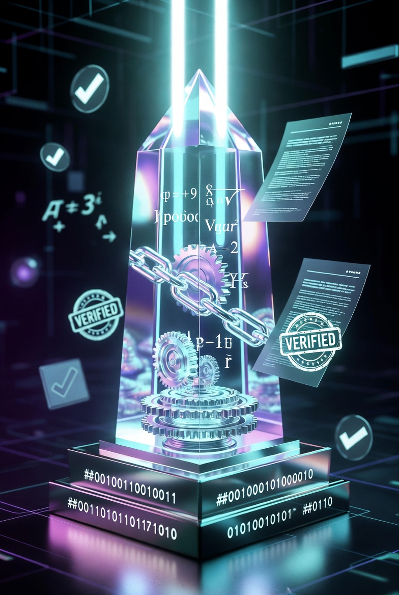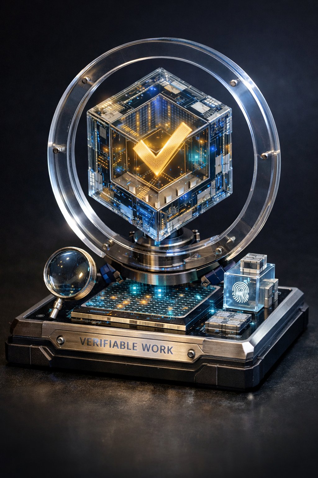 This digital sculpture represents the philosophy of verifiable work. Just like this glass block, true work shouldn't need a middleman to explain it—the proof is embedded in the structure.
