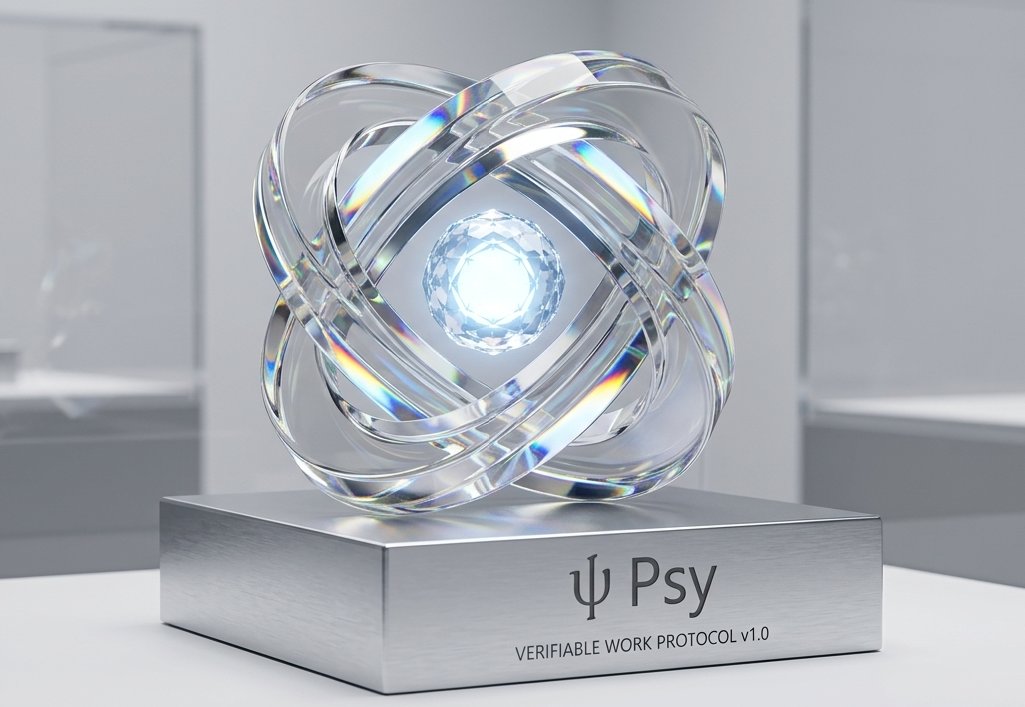 Psy’s philosophy: Transparent crystalline layers reveal a glowing core, symbolizing total process transparency and immutable proof. In Verifiable Work, truth is shown, not just claimed.